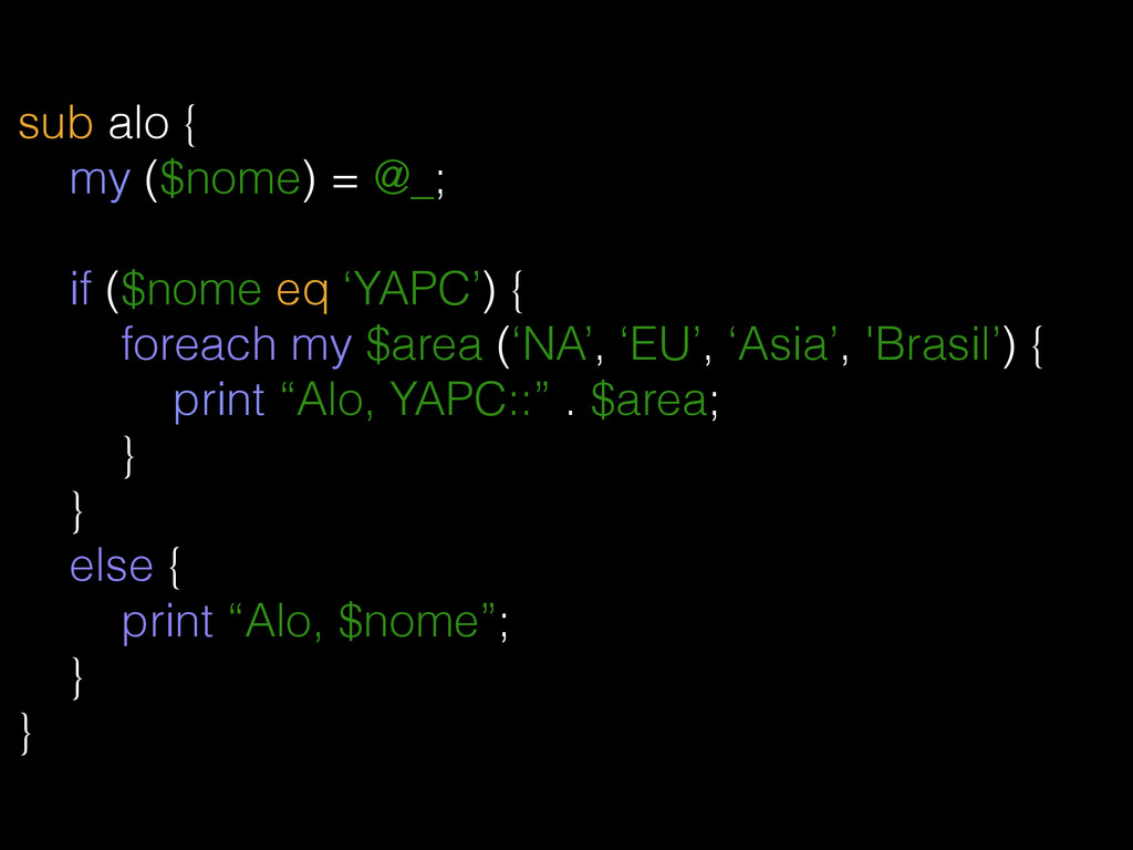 ‘YAPC’) { foreach my $area (‘NA’, ‘EU’, ‘Asia’, 'Brasil’) { print “Alo, YAPC::” . $area; } } else { print “Alo, $nome”; } }