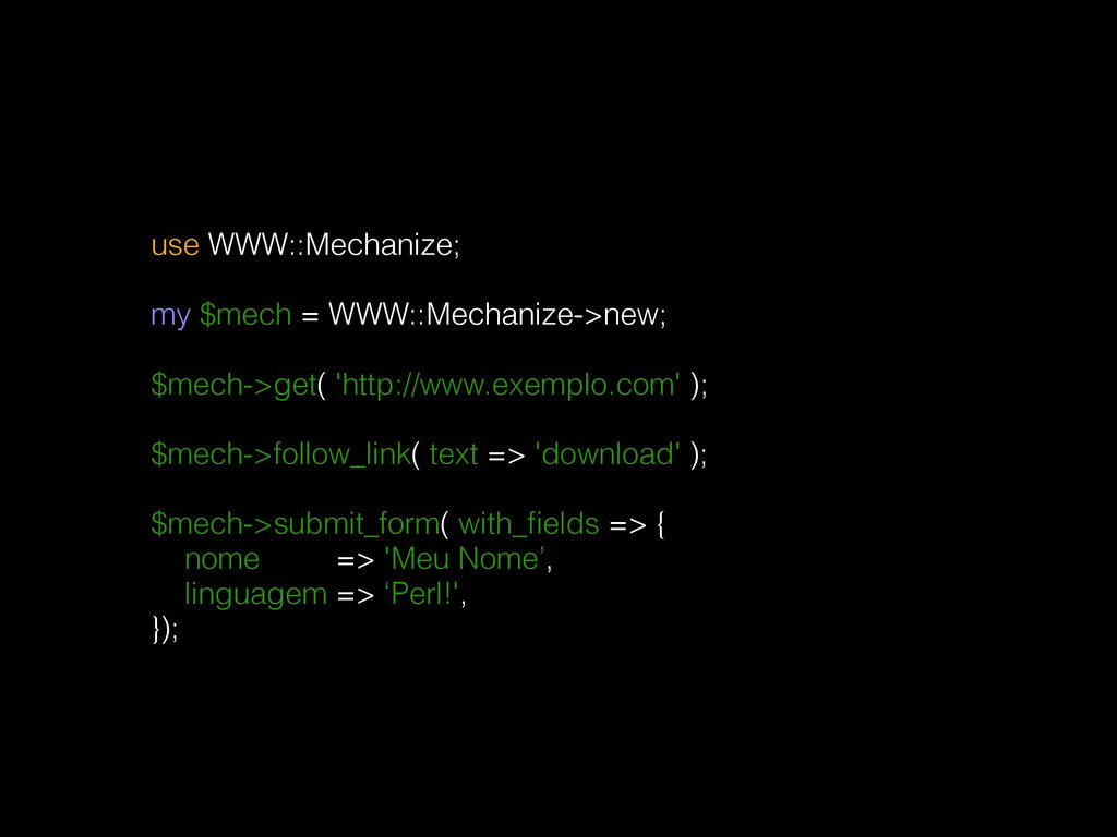 'http://www.exemplo.com' ); ! $mech->follow_link( text => 'download' ); ! $mech->submit_form( with_fields => { nome => 'Meu Nome’, linguagem => ‘Perl!', });