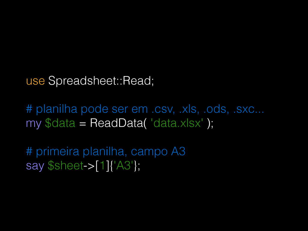 .xls, .ods, .sxc... my $data = ReadData( 'data.xlsx' ); ! # primeira planilha, campo A3 say $sheet->[1]{'A3'};
