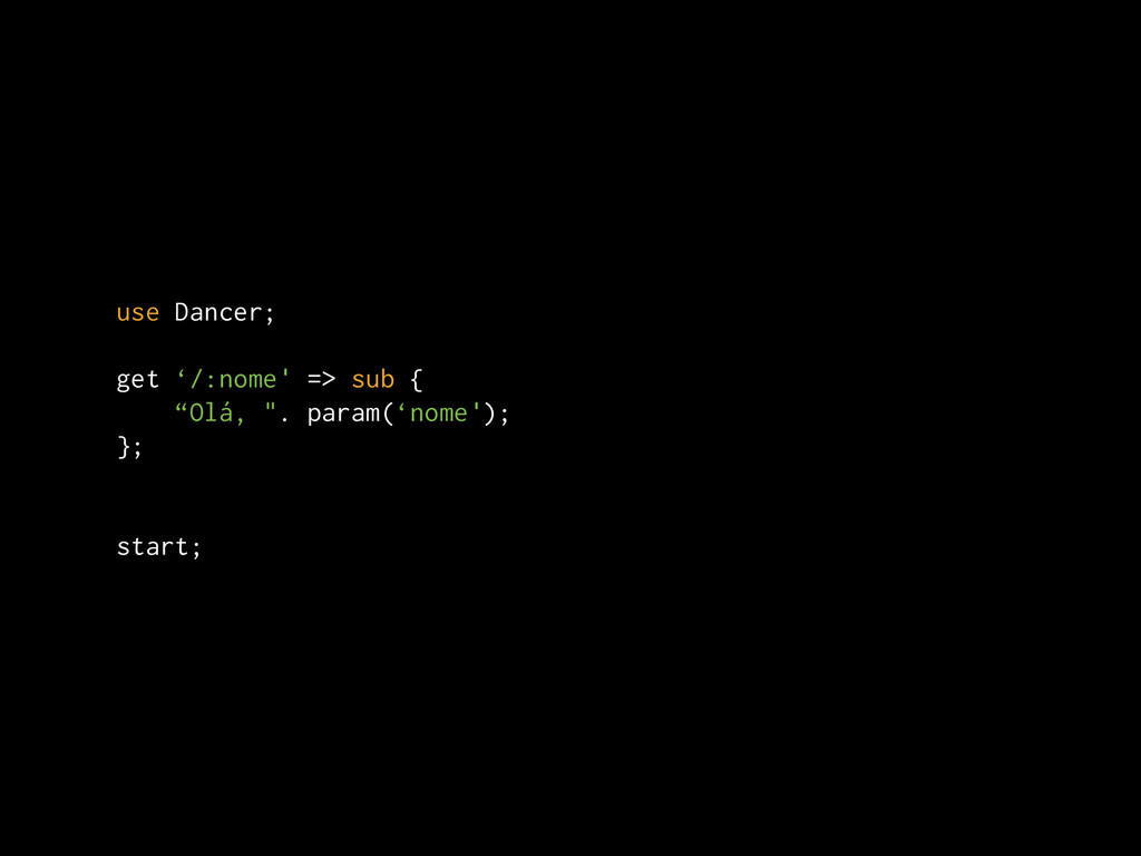 11. use Dancer; ! get ‘/:nome' => sub { “Olá, ".