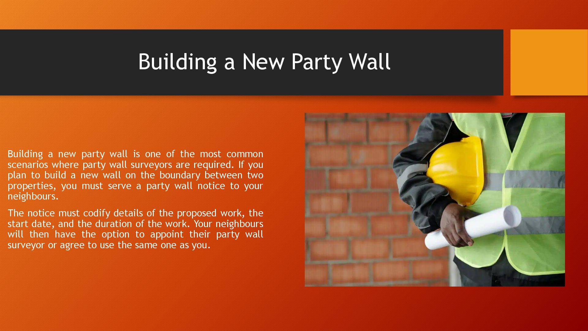 is one of the most common scenarios where party wall surveyors are required. If you plan to build a new wall on the boundary between two properties, you must serve a party wall notice to your neighbours. The notice must codify details of the proposed work, the start date, and the duration of the work. Your neighbours will then have the option to appoint their party wall surveyor or agree to use the same one as you.