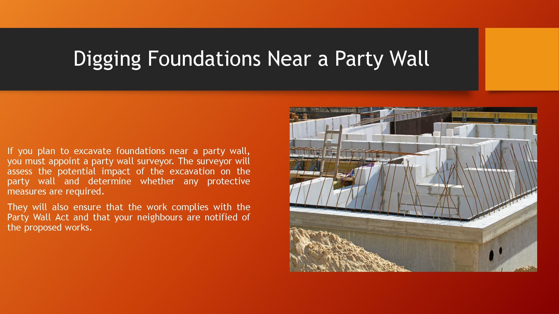 excavate foundations near a party wall, you must appoint a party wall surveyor. The surveyor will assess the potential impact of the excavation on the party wall and determine whether any protective measures are required. They will also ensure that the work complies with the Party Wall Act and that your neighbours are notified of the proposed works.