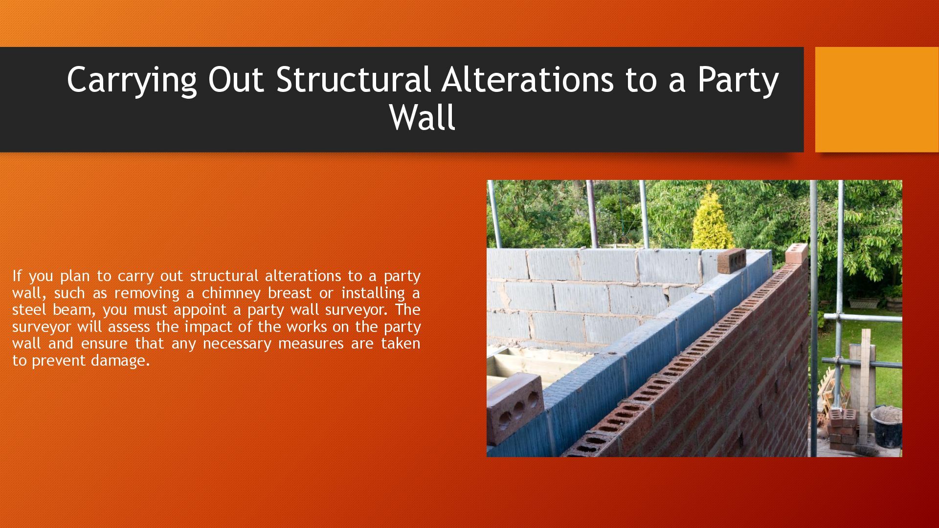 plan to carry out structural alterations to a party wall, such as removing a chimney breast or installing a steel beam, you must appoint a party wall surveyor. The surveyor will assess the impact of the works on the party wall and ensure that any necessary measures are taken to prevent damage.