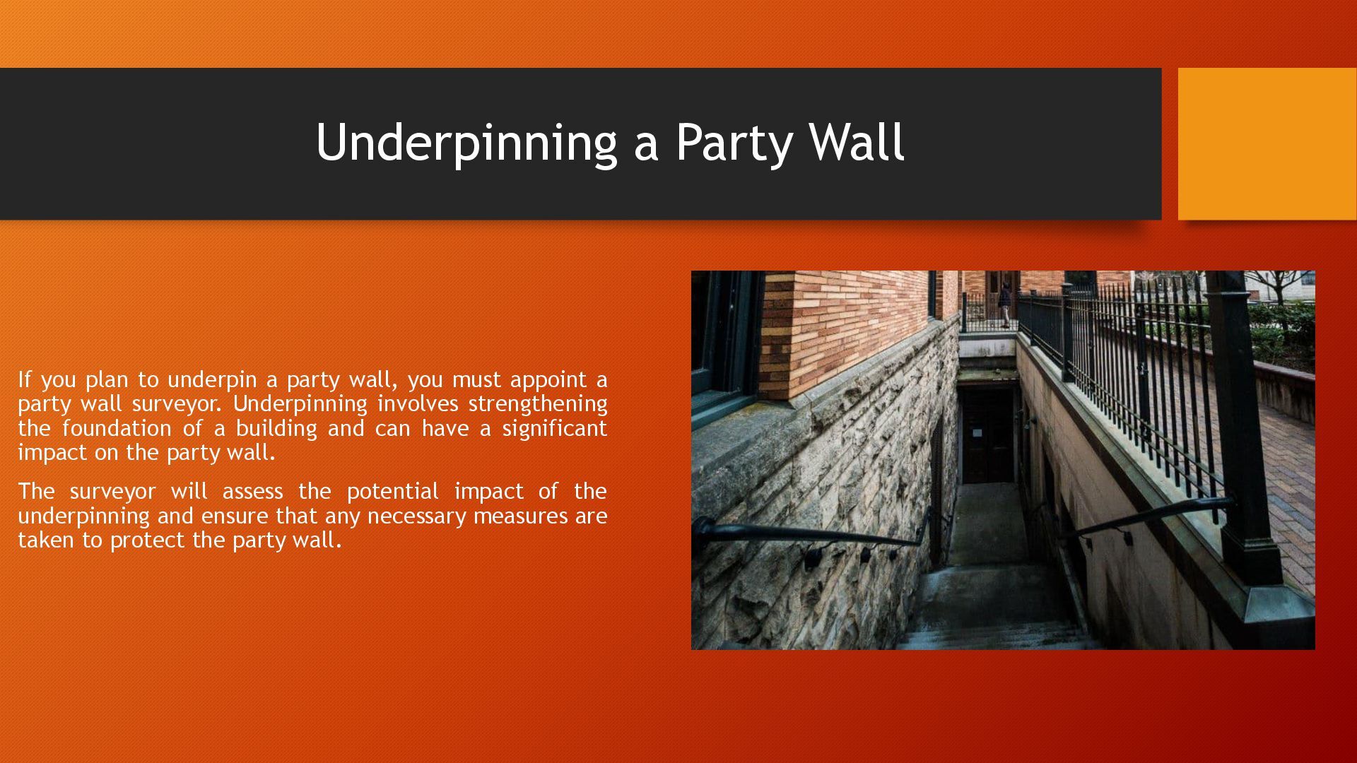 party wall, you must appoint a party wall surveyor. Underpinning involves strengthening the foundation of a building and can have a significant impact on the party wall. The surveyor will assess the potential impact of the underpinning and ensure that any necessary measures are taken to protect the party wall.