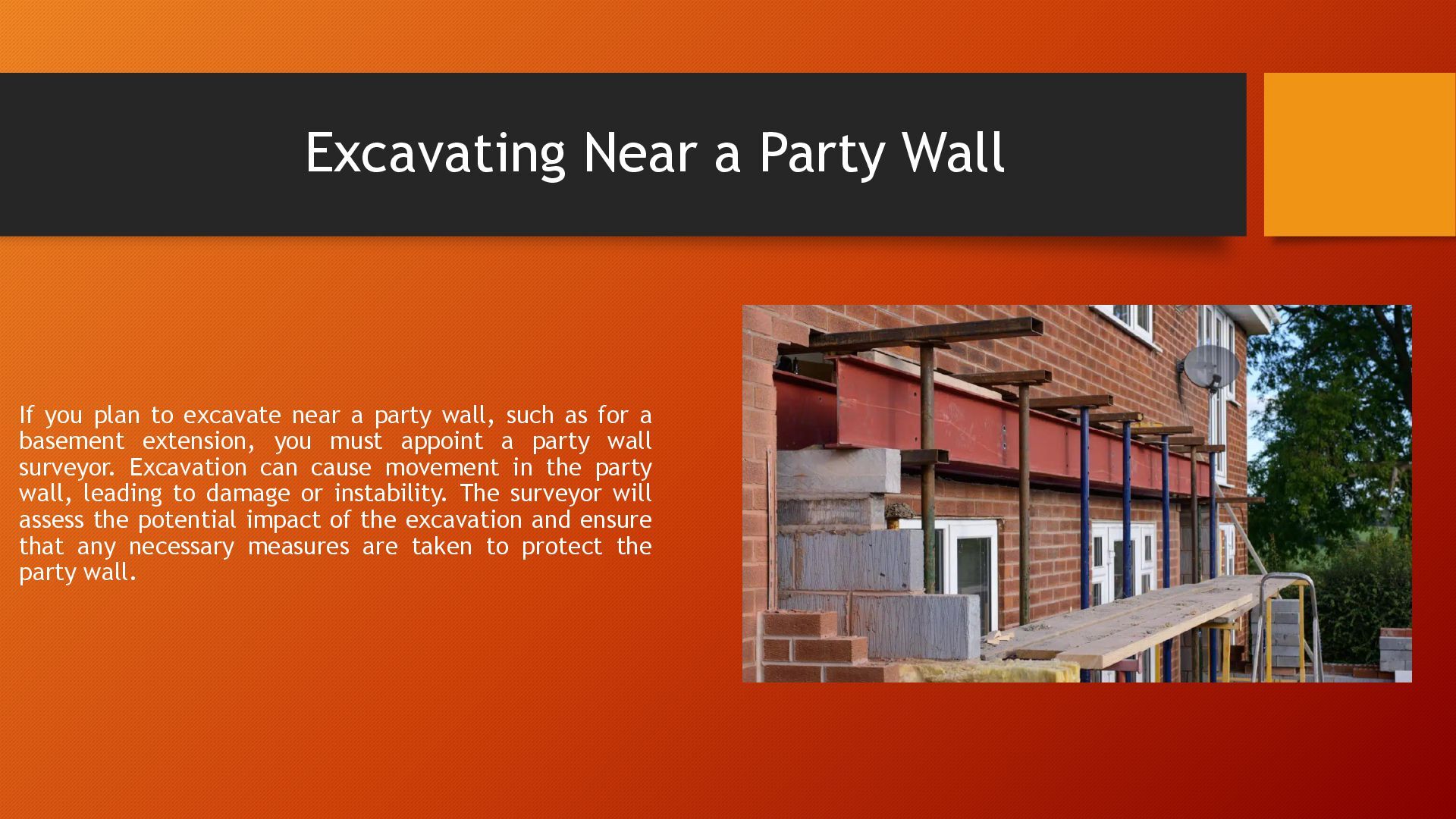 near a party wall, such as for a basement extension, you must appoint a party wall surveyor. Excavation can cause movement in the party wall, leading to damage or instability. The surveyor will assess the potential impact of the excavation and ensure that any necessary measures are taken to protect the party wall.