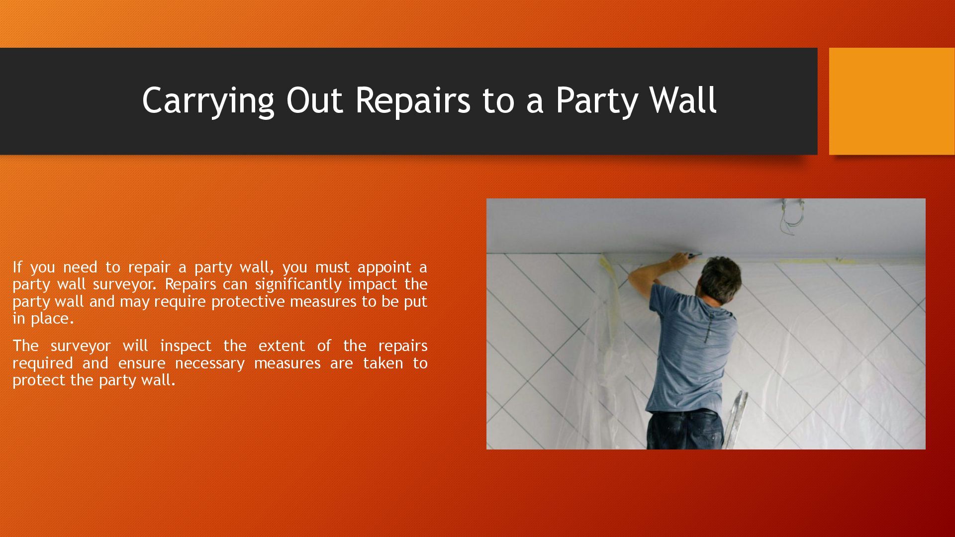 to repair a party wall, you must appoint a party wall surveyor. Repairs can significantly impact the party wall and may require protective measures to be put in place. The surveyor will inspect the extent of the repairs required and ensure necessary measures are taken to protect the party wall.