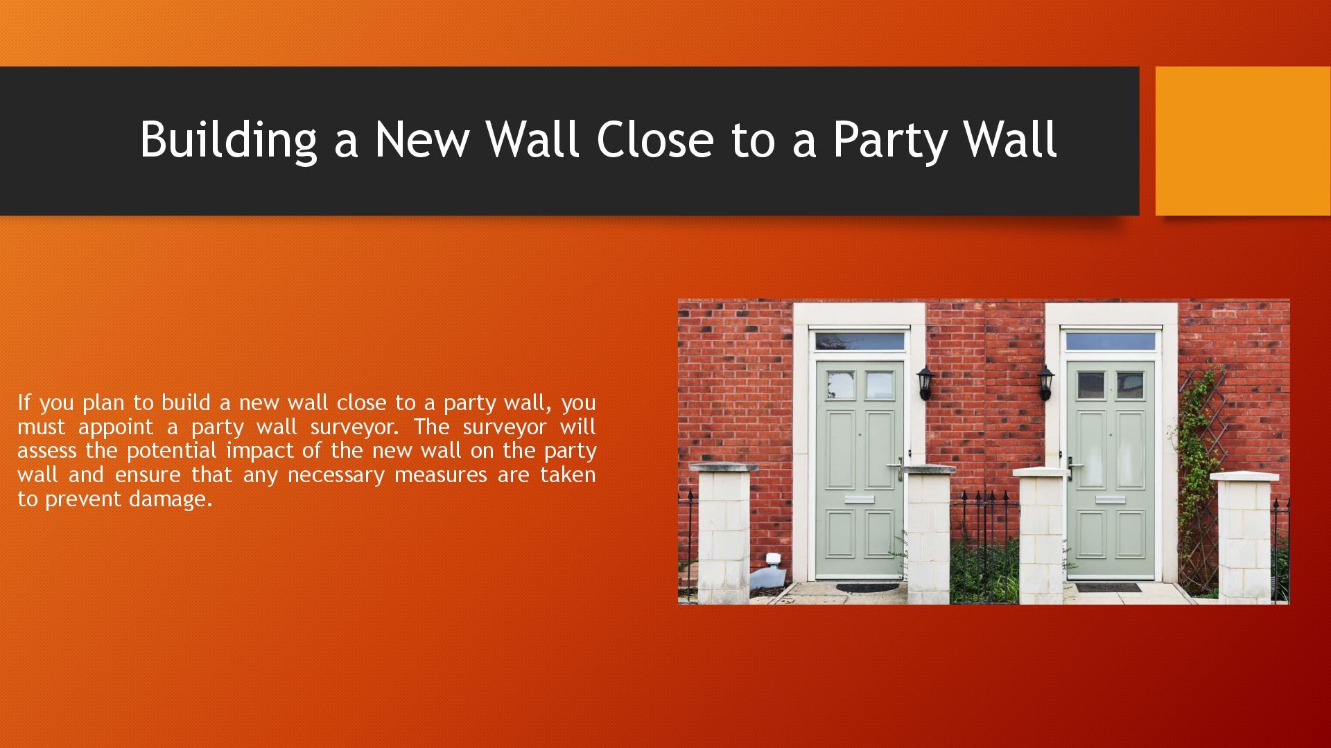 you plan to build a new wall close to a party wall, you must appoint a party wall surveyor. The surveyor will assess the potential impact of the new wall on the party wall and ensure that any necessary measures are taken to prevent damage.