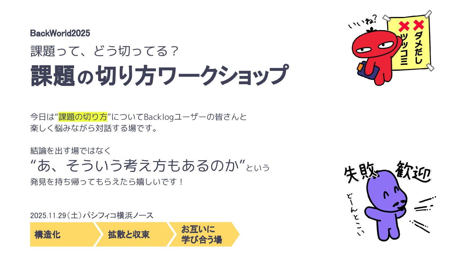 # info - 告知URL : https://backlogworld.doorkeeper.jp/events/191718 - 2025-11-29(土)10:15 - 11:45 JST パシフィコ横浜ノース Bホール