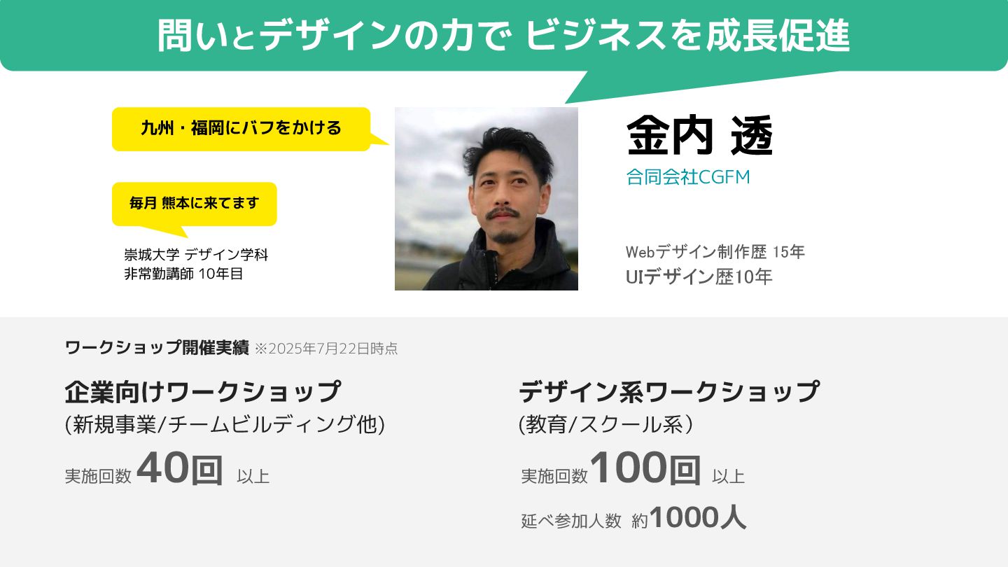 (教育/スクール系) 実施回数 100回 以上 延べ参加人数 約 1000人 ワークショップ開催実績 ※2025年7月22日時点 崇城大学 デザイン学科 非常勤講師 10年目 九州・福岡にバフをかける 合同会社CGFM Webデザイン制作歴 15年 UIデザイン歴10年 毎月 熊本に来てます