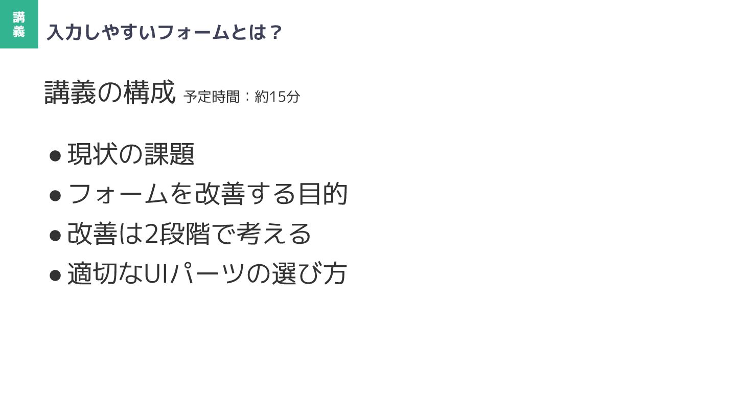 • 現状の課題 • フォームを改善する目的 • 改善は2段階で考える • 適切なUIパーツの選び方 入力しやすいフォームとは? 講
