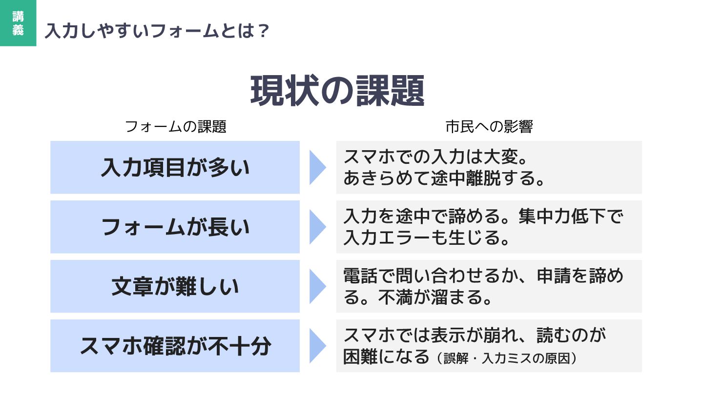 電話で問い合わせるか、申請を諦め る。不満が溜まる。 市民への影響 フォームの課題 入力しやすいフォームとは? 講 義 スマホ確認が不十分
