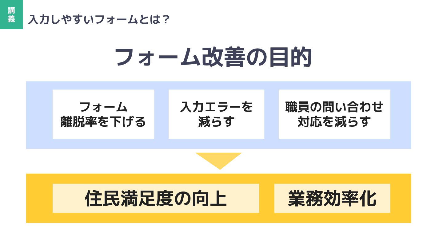 入力しやすいフォームとは? 講 義 フォーム 離脱率を下げる フォーム改善の目的 住民満足度の向上 入力エラーを 減らす 職員の問い合わせ