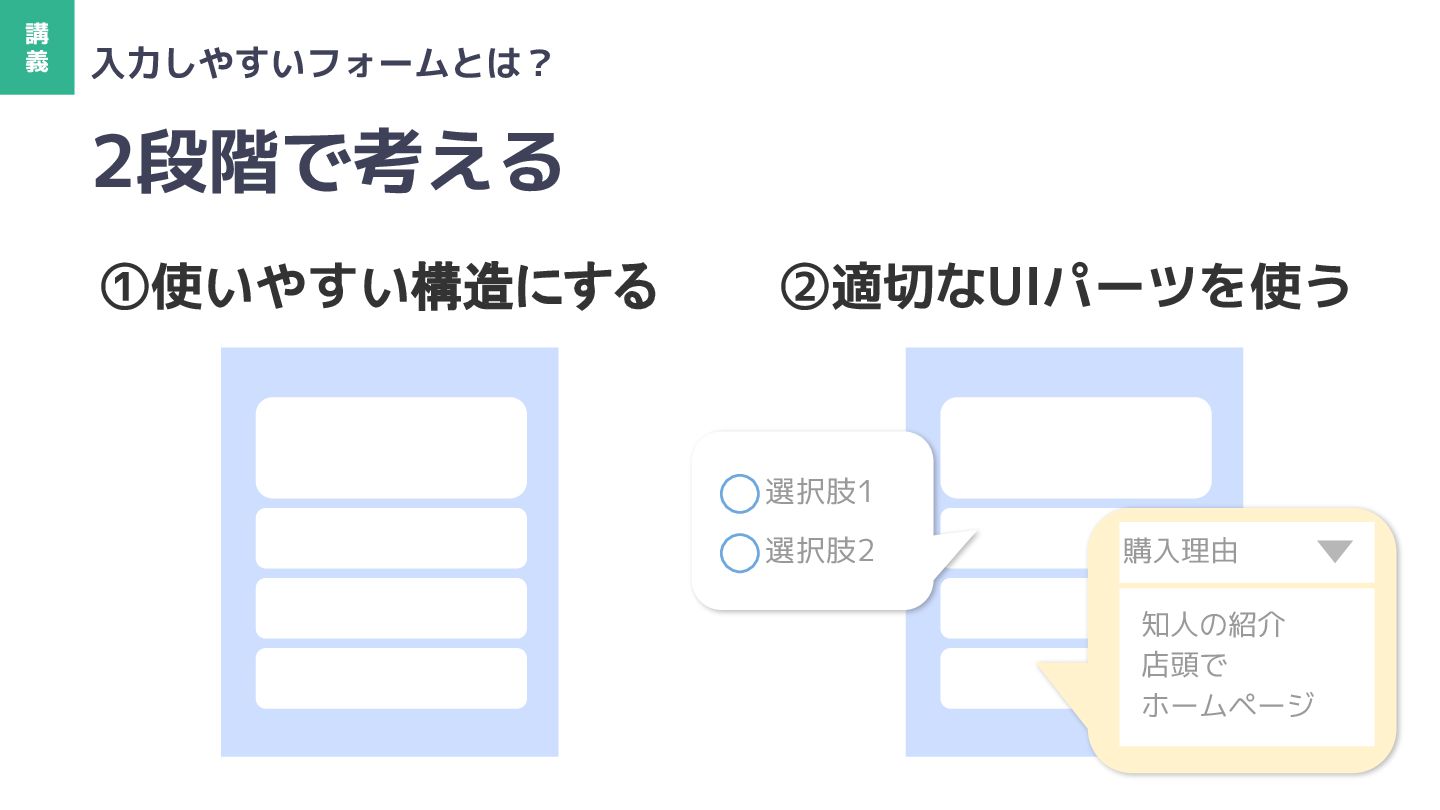 入力しやすいフォームとは? 講 義 ②適切なUIパーツを使う 2段階で考える ①使いやすい構造にする 選択肢1 選択肢2 購入理由 知人の紹介