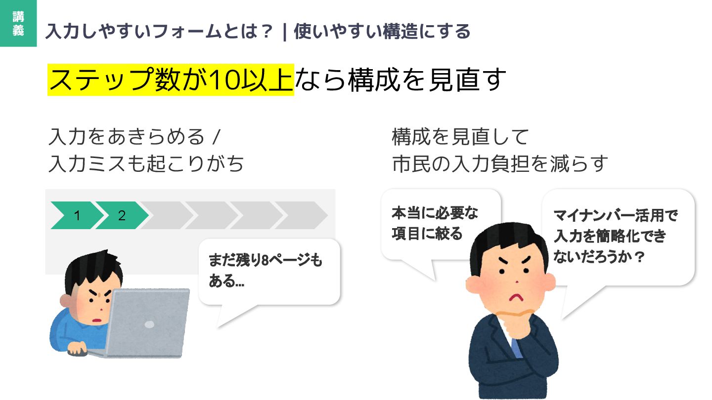入力しやすいフォームとは?|使いやすい構造にする 講 義 ステップ数が10以上なら構成を見直す 入力をあきらめる / 入力ミスも起こりがち 構成を見直して 市民の入力負担を減らす まだ残り8ページも