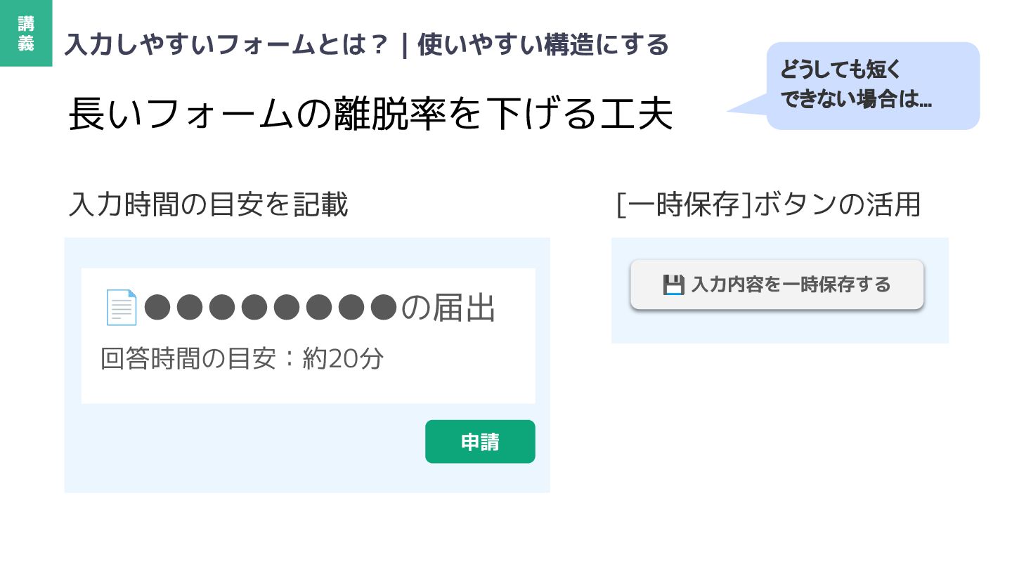 入力しやすいフォームとは?|使いやすい構造にする 講 義 長いフォームの離脱率を下げる工夫 入力時間の目安を記載 [一時保存]ボタンの活用 どうしても短く できない場合は...