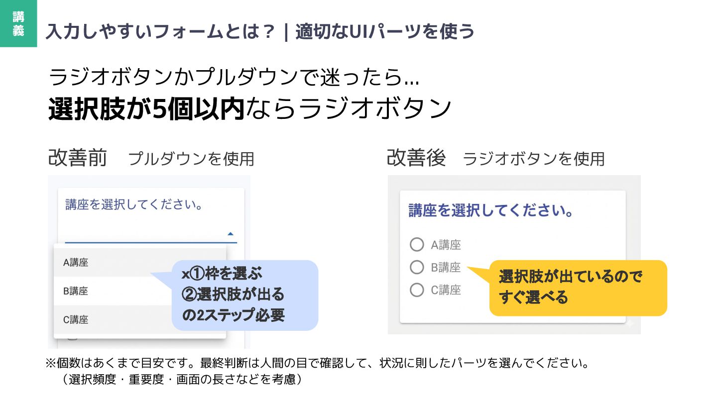 入力しやすいフォームとは? | 適切なUIパーツを使う 講 義 ラジオボタンかプルダウンで迷ったら... 選択肢が5個以内ならラジオボタン 改善前 プルダウンを使用 改善後 ラジオボタンを使用 ※個数はあくまで目安です。最終判断は人間の目で確認して、状況に則したパーツを選んでください。