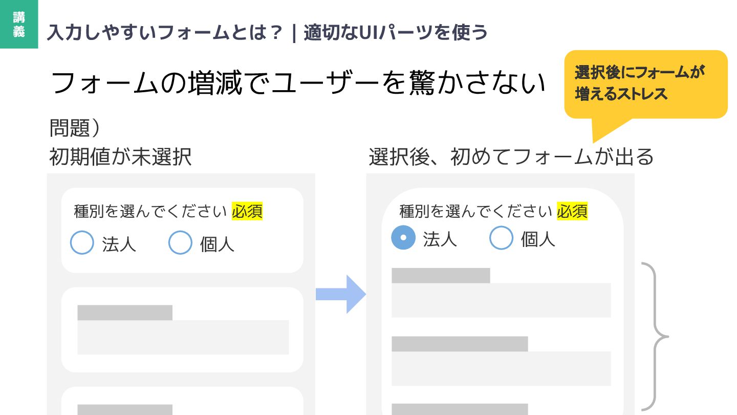 種別を選んでください 必須 入力しやすいフォームとは? | 適切なUIパーツを使う 講 義 フォームの増減でユーザーを驚かさない 初期値が未選択 選択後、初めてフォームが出る