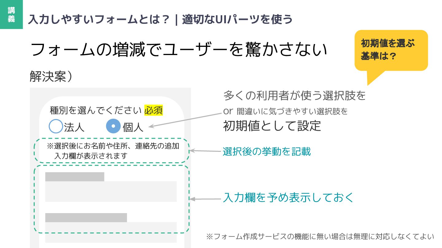 入力しやすいフォームとは? | 適切なUIパーツを使う 講 義 フォームの増減でユーザーを驚かさない 多くの利用者が使う選択肢を or 間違いに気づきやすい選択肢を 初期値として設定