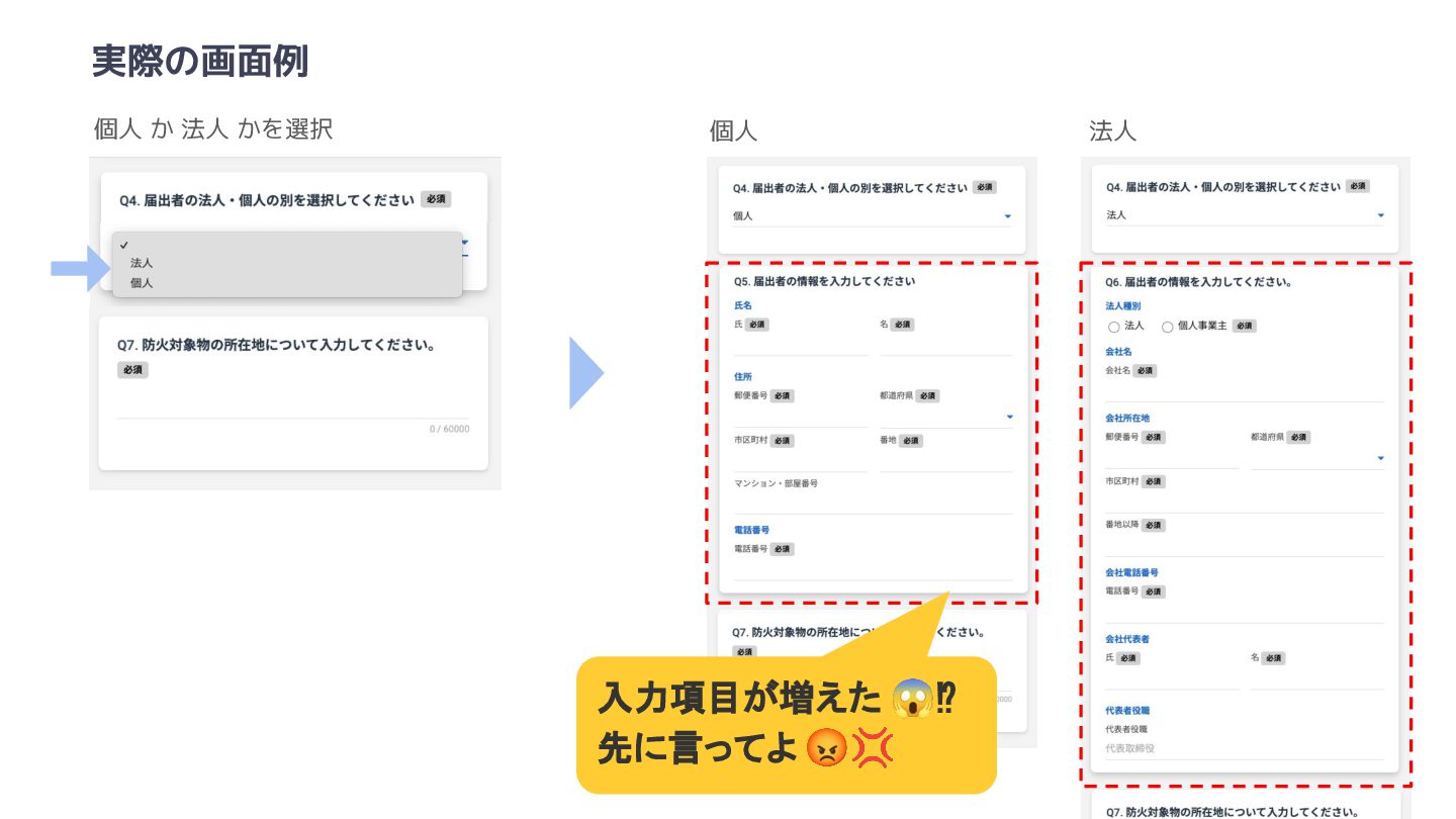 選択後にフォームが 増えるストレス 法人 個人 法人 個人 種別を選んでください 必須 問題)