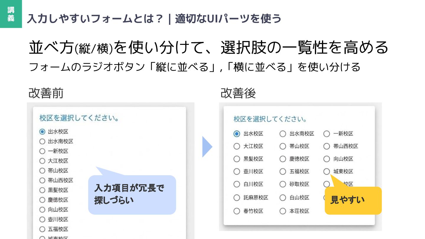 入力しやすいフォームとは? | 適切なUIパーツを使う 講 義 並べ方(縦/横)を使い分けて、選択肢の一覧性を高める 改善前 改善後 入力項目が冗長で