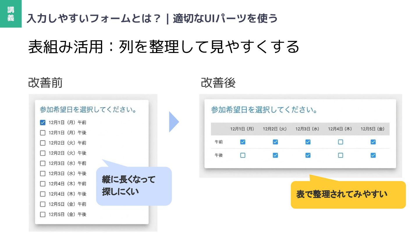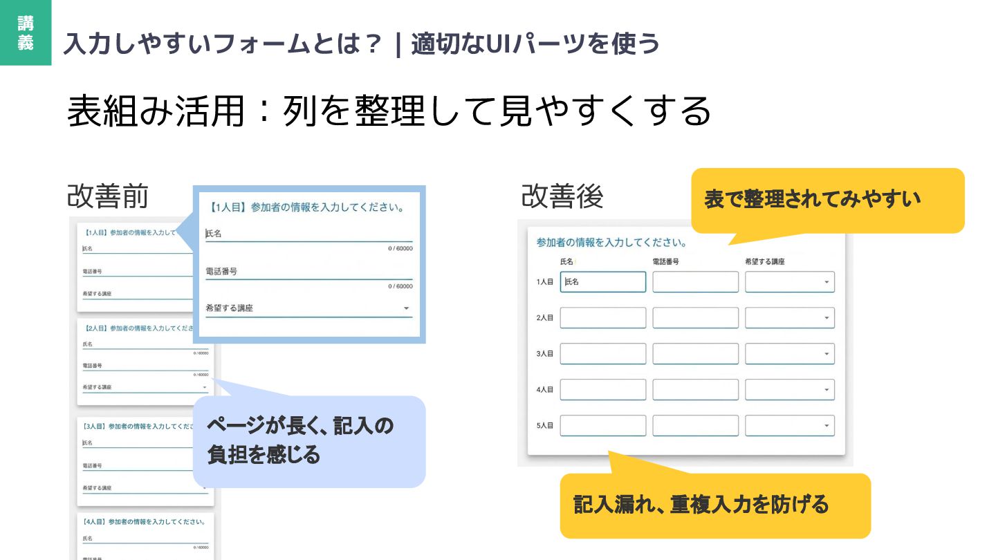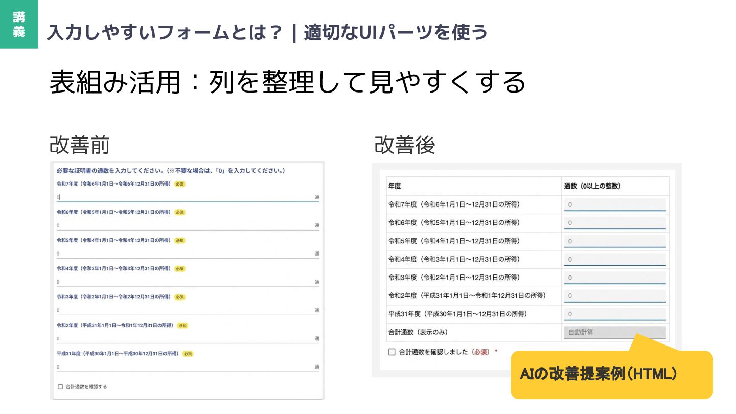 入力しやすいフォームとは?|適切なUIパーツを使う 講 義 表組み活用:列を整理して見やすくする 改善前 改善後 AIの改善提案例(HTML)