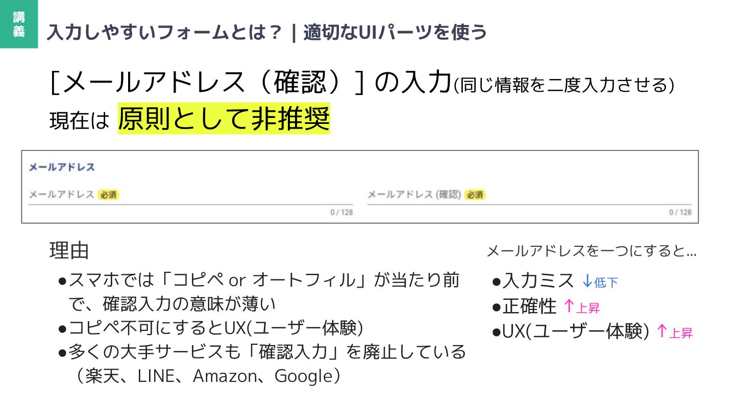 入力しやすいフォームとは?|適切なUIパーツを使う 講 義 [メールアドレス(確認)] の入力(同じ情報を二度入力させる) 現在は 原則として非推奨 理由 •スマホでは「コピペ or