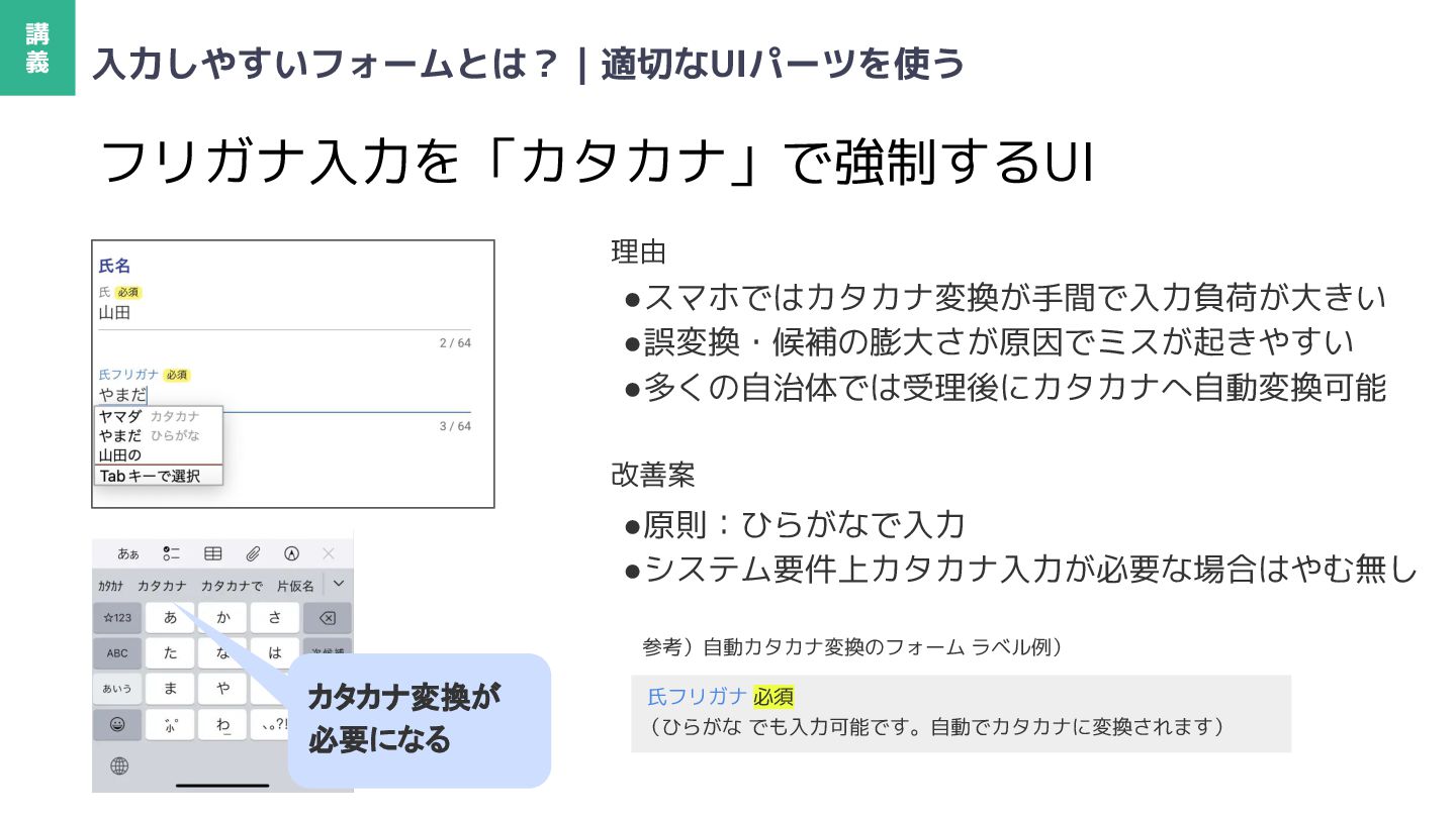 入力しやすいフォームとは?|適切なUIパーツを使う 講 義 フリガナ入力を「カタカナ」で強制するUI 理由 •スマホではカタカナ変換が手間で入力負荷が大きい •誤変換・候補の膨大さが原因でミスが起きやすい •多くの自治体では受理後にカタカナへ自動変換可能 改善案 •原則:ひらがなで入力