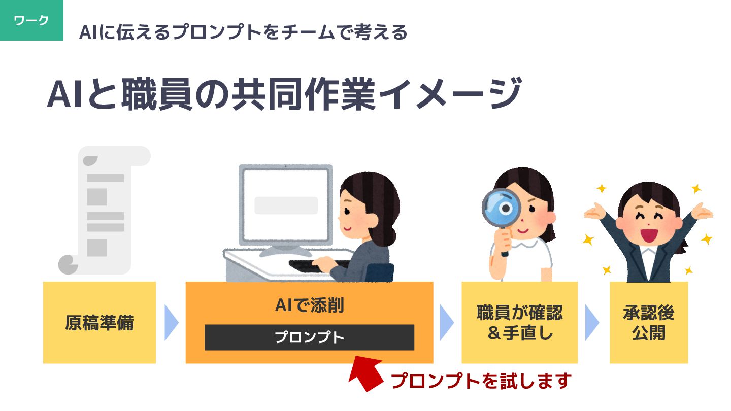 AIと職員の共同作業イメージ AIに伝えるプロンプトをチームで考える ワーク AIで添削 職員が確認 &手直し 承認後 公開 プロンプト 原稿準備