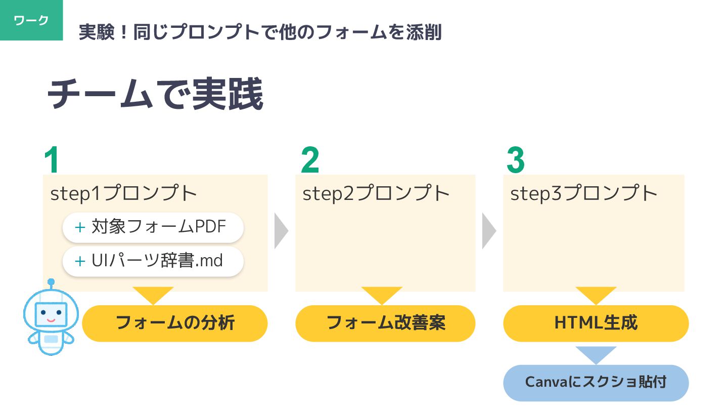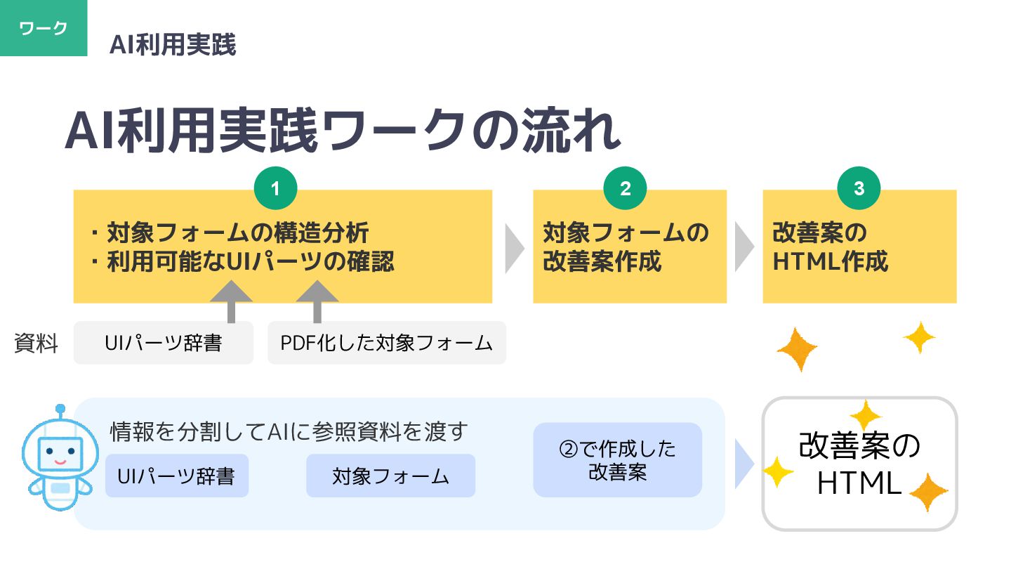 AI利用実践ワークの流れ AI利用実践 ワーク ・対象フォームの構造分析 ・利用可能なUIパーツの確認 1 対象フォームの 改善案作成 2 改善案の