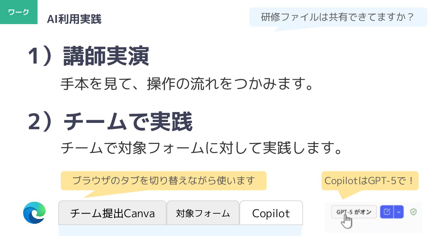 1)講師実演 AI利用実践 ワーク 2)チームで実践 チームで対象フォームに対して実践します。 手本を見て、操作の流れをつかみます。 Copilot チーム提出Canva 対象フォーム ブラウザのタブを切り替えながら使います