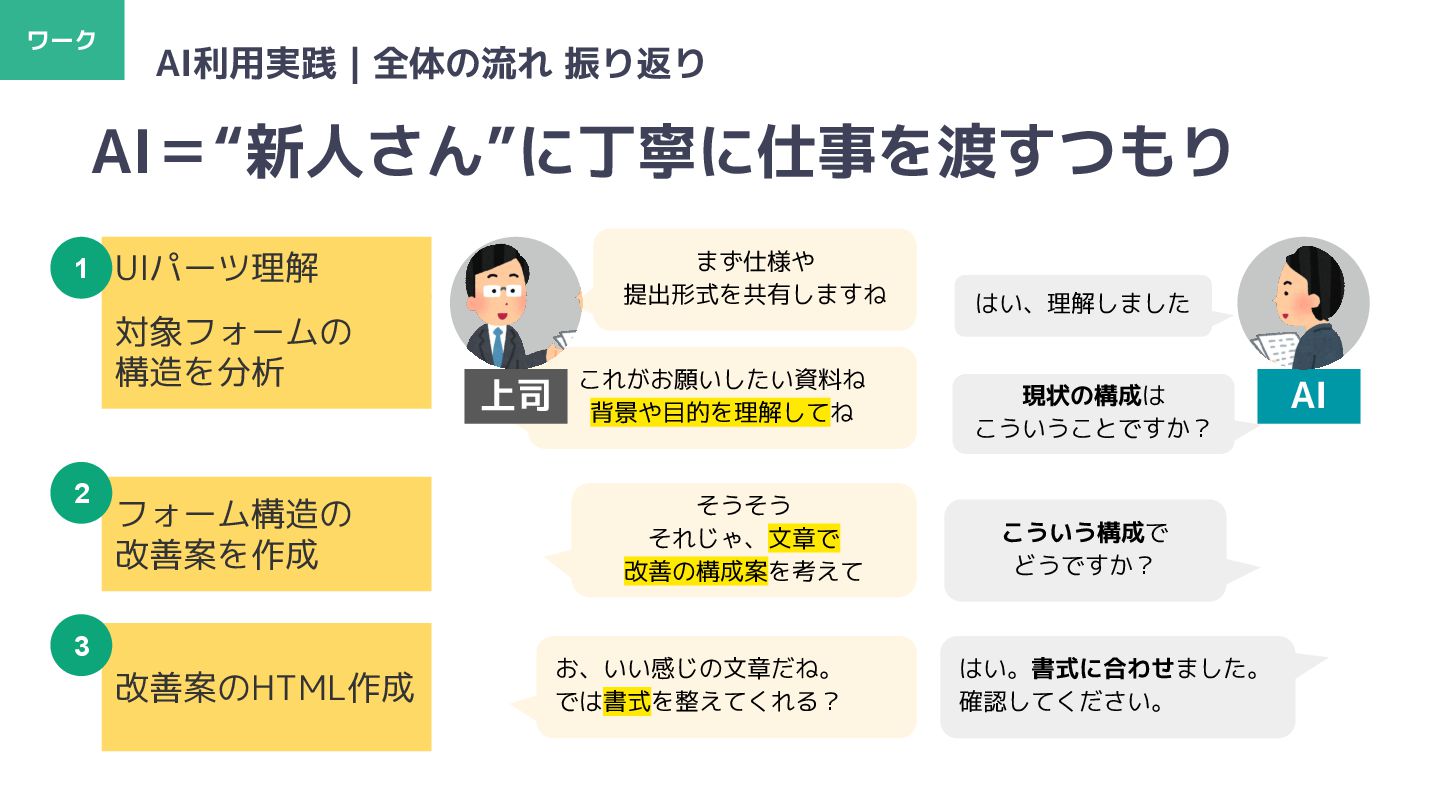 AI=“新人さん”に丁寧に仕事を渡すつもり AI利用実践|全体の流れ 振り返り ワーク UIパーツ理解 1 フォーム構造の 改善案を作成 改善案のHTML作成 3