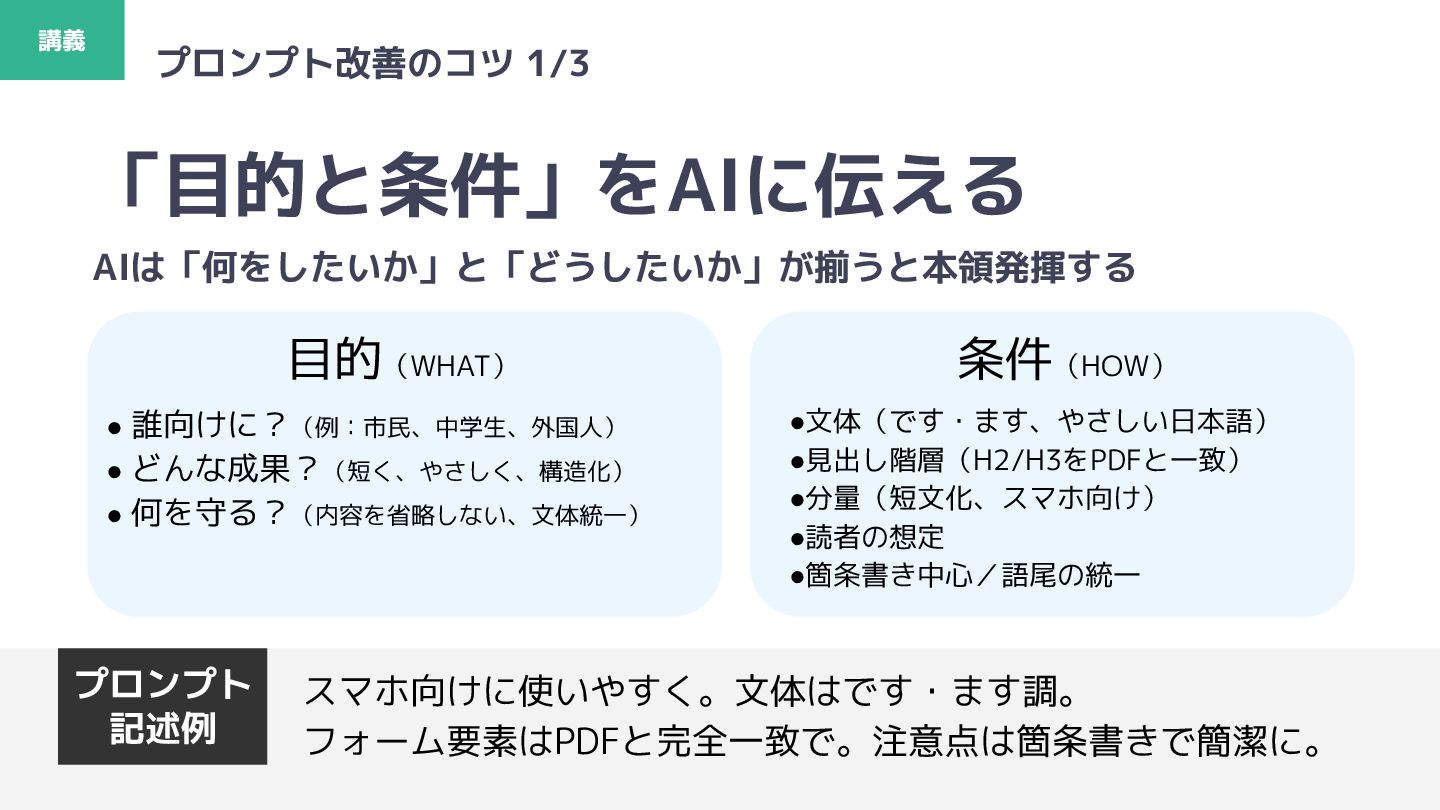 プロンプト改善のコツ 1/3 講義 • 誰向けに?(例:市民、中学生、外国人) • どんな成果?(短く、やさしく、構造化) • 何を守る?(内容を省略しない、文体統一) 「目的と条件」をAIに伝える