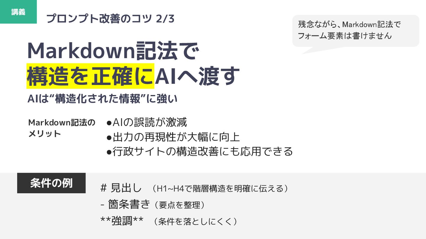 箇条書き(要点を整理) **強調** (条件を落としにくく) •AIの誤読が激減 •出力の再現性が大幅に向上 •行政サイトの構造改善にも応用できる 条件の例 Markdown記法の メリット 残念ながら、Markdown記法で フォーム要素は書けません
