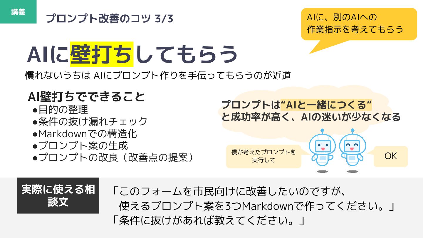 で情報を整理する 3. AIに壁打ちしてプロンプトを作ってもらう 相談しながら“最適な型”を生成・改善していく AIは異動のない 「良き相棒」だと 思って、みなさんで 育て続けてください