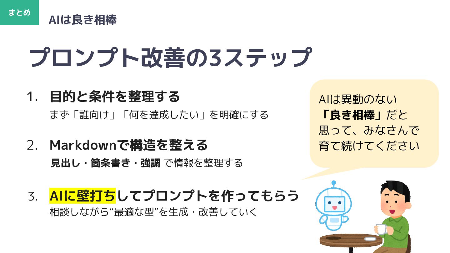 プロンプト改善の3ステップ AIは良き相棒 まとめ 1. 目的と条件を整理する まず「誰向け」「何を達成したい」を明確にする 2. Markdownで構造を整える 見出し・箇条書き・強調