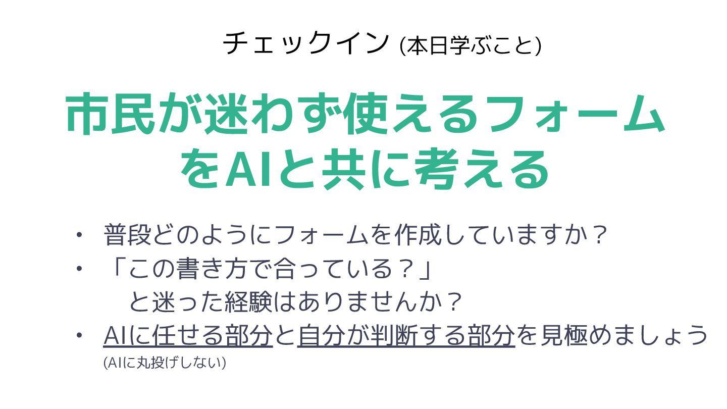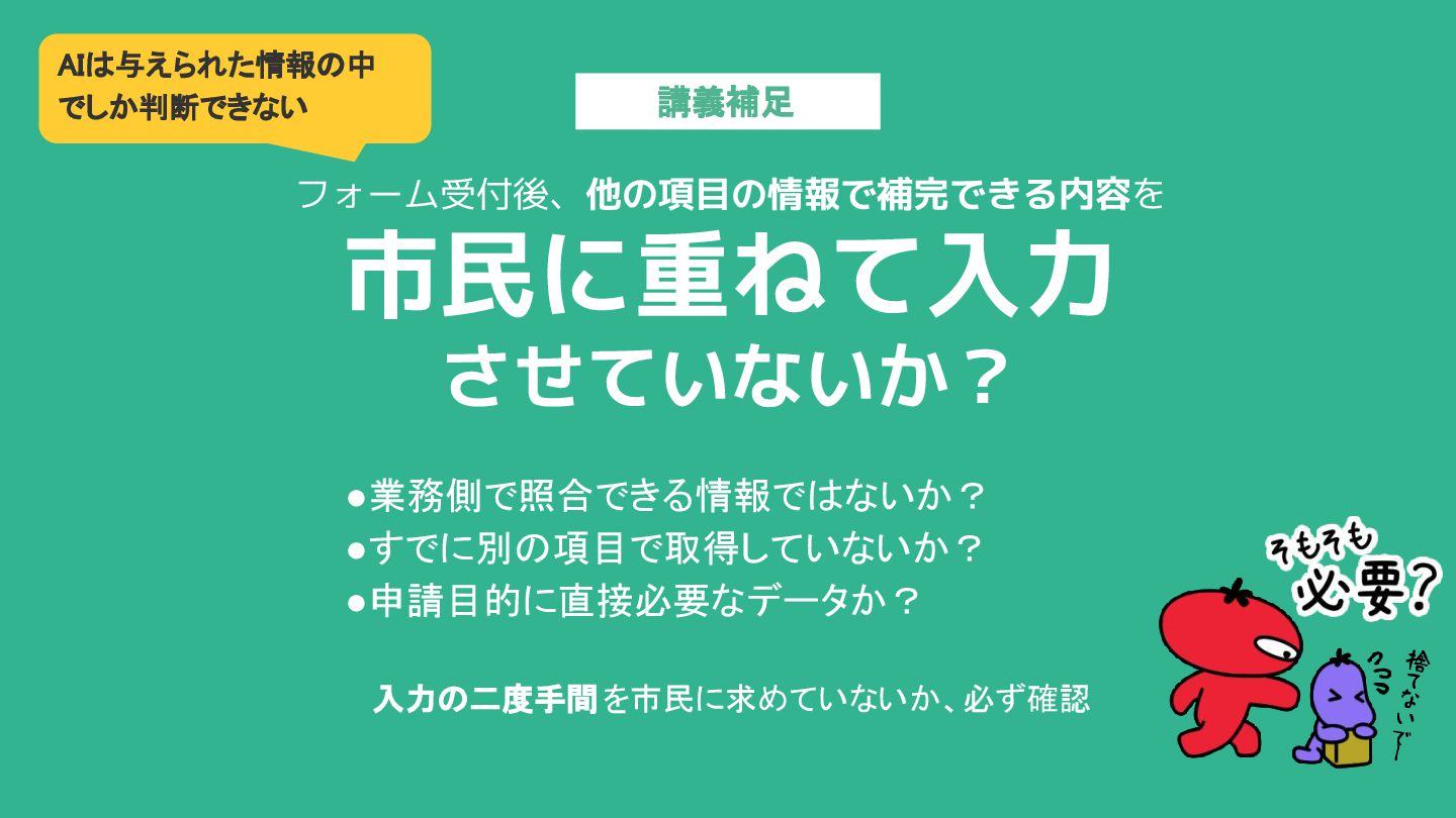 入力の二度手間を市民に求めていないか、必ず確認 •業務側で照合できる情報ではないか? •すでに別の項目で取得していないか? •申請目的に直接必要なデータか? 講義補足 フォーム受付後、他の項目の情報で補完できる内容を 市民に重ねて入力 させていないか? AIは与えられた情報の中