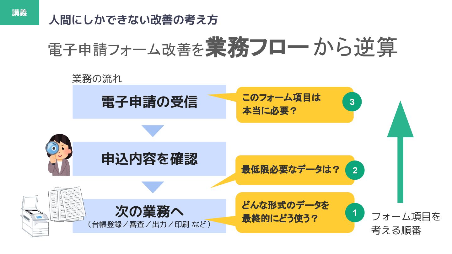 電子申請フォーム改善を業務フロー から逆算 電子申請の受信 申込内容を確認 次の業務へ (台帳登録/審査/出力/印刷 など) 業務の流れ どんな形式のデータを