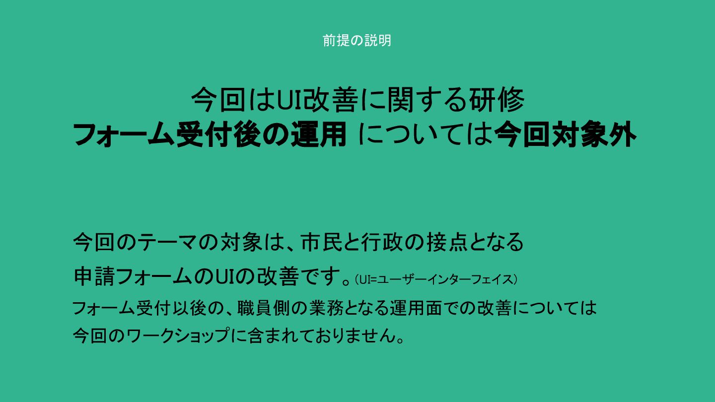 前提の説明 今回はUI改善に関する研修 フォーム受付後の運用 については今回対象外 今回のテーマの対象は、市民と行政の接点となる 申請フォームのUIの改善です。(UI=ユーザーインターフェイス) フォーム受付以後の、職員側の業務となる運用面での改善については 今回のワークショップに含まれておりません。