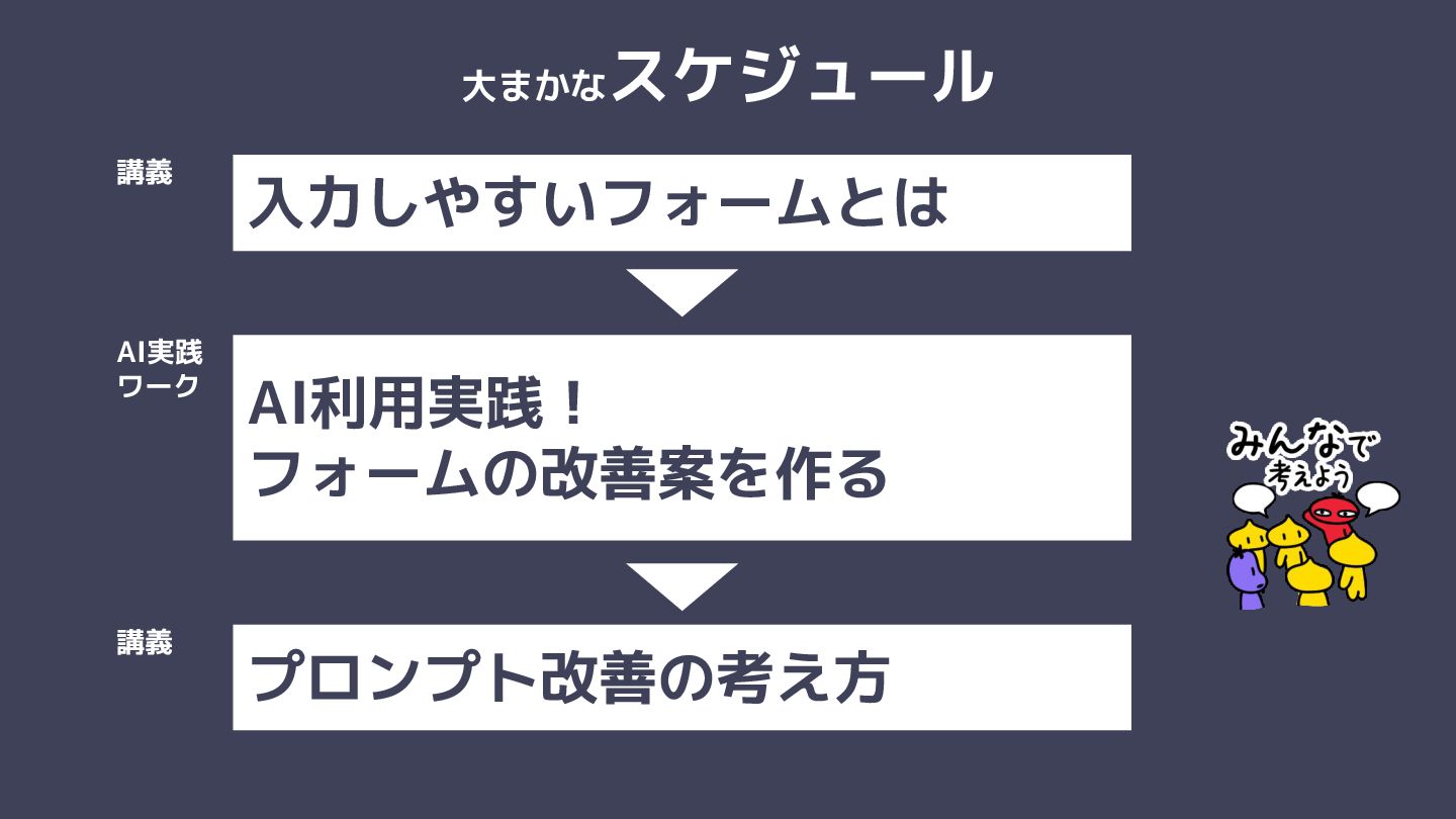 大まかな スケジュール 入力しやすいフォームとは 講義 AI実践 ワーク プロンプト改善の考え方 講義 AI利用実践! フォームの改善案を作る