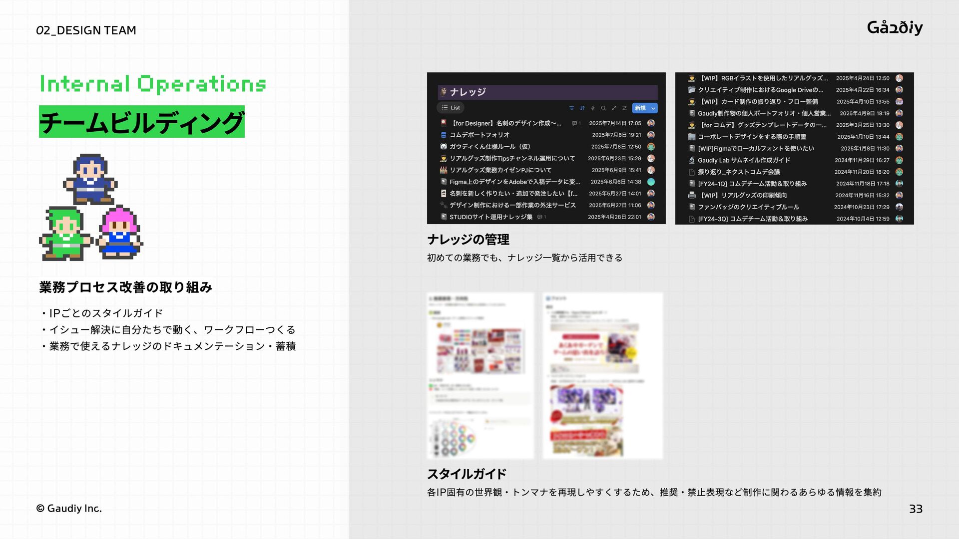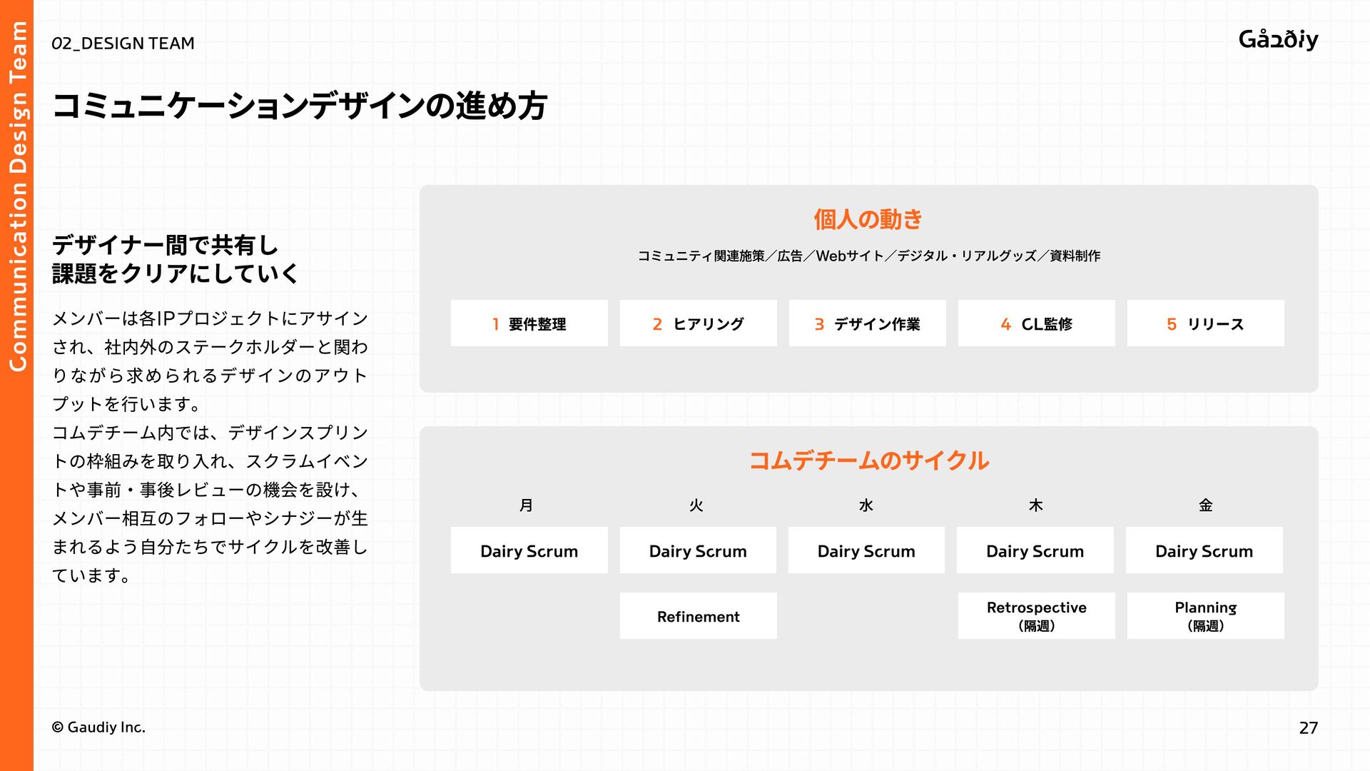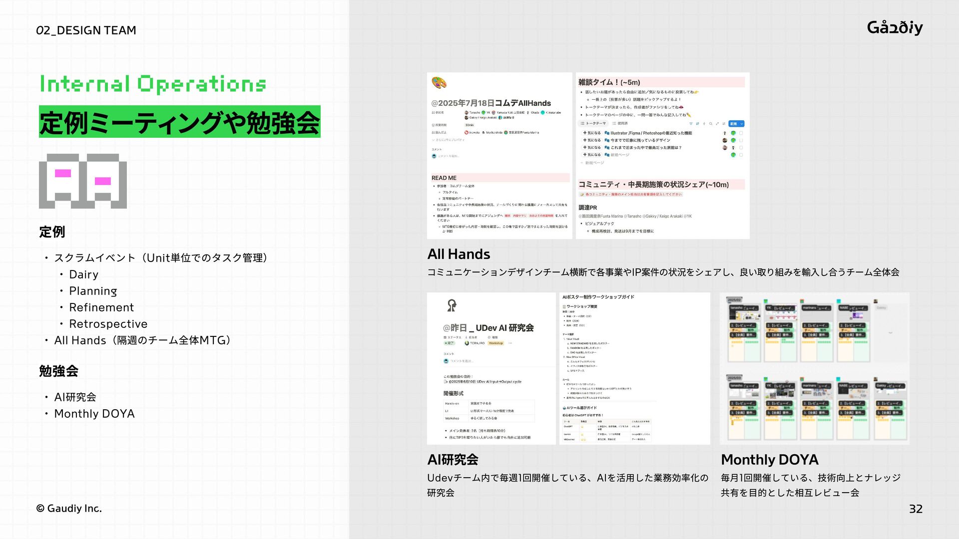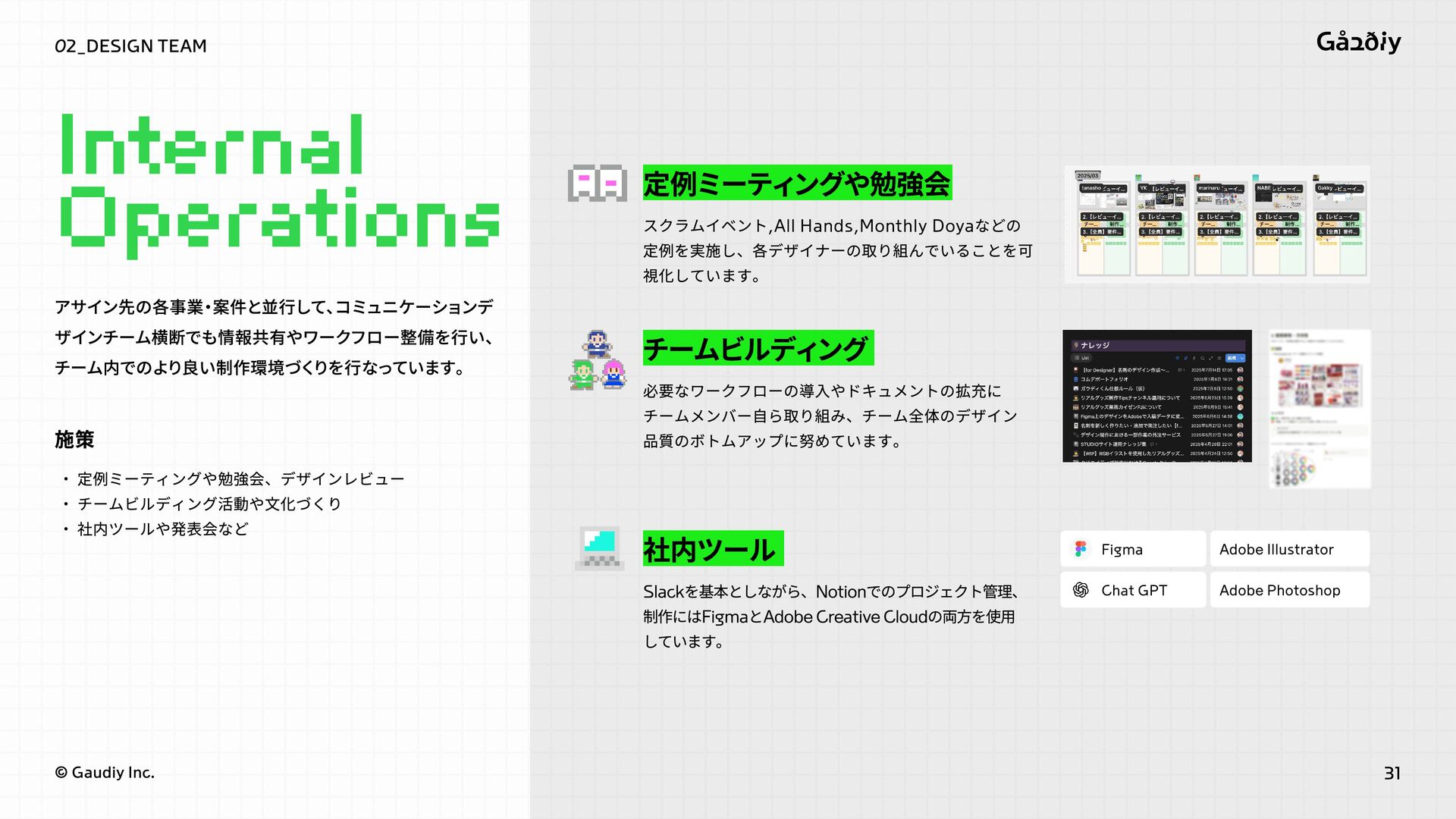 案件と並行して、 コミュニケーションデ ザインチーム横断でも情報共有やワークフロー整備を行い、 チーム内でのより良い制作環境づく りを行なっています。 施策 定例ミーティングや勉強会、デザインレビュー チームビルディング活動や文化づくり 社内ツールや発表会など 定例ミーティ ングや勉強会 スクラムイベント,All Hands,Monthly Doyaなどの 定例を実施し、各デザイナーの取り組んでいることを可 視化しています。 チームビルディ ング 必要な ワーク フローの 導入や ドキュ メントの 拡充に チーム メン バー 自ら取り組 み、チーム 全体のデザイン 品質の ボトム アップに努めています。 社内ツール Sla ckを 基本としな がら、 Not ionでの プロジェクト 管理、 制作にはFigmaとAdo be Creat ive Clo udの 両方を 使用 しています。 Figma Ado be Ill ust rato r Ado be Photosho p Chat GPT