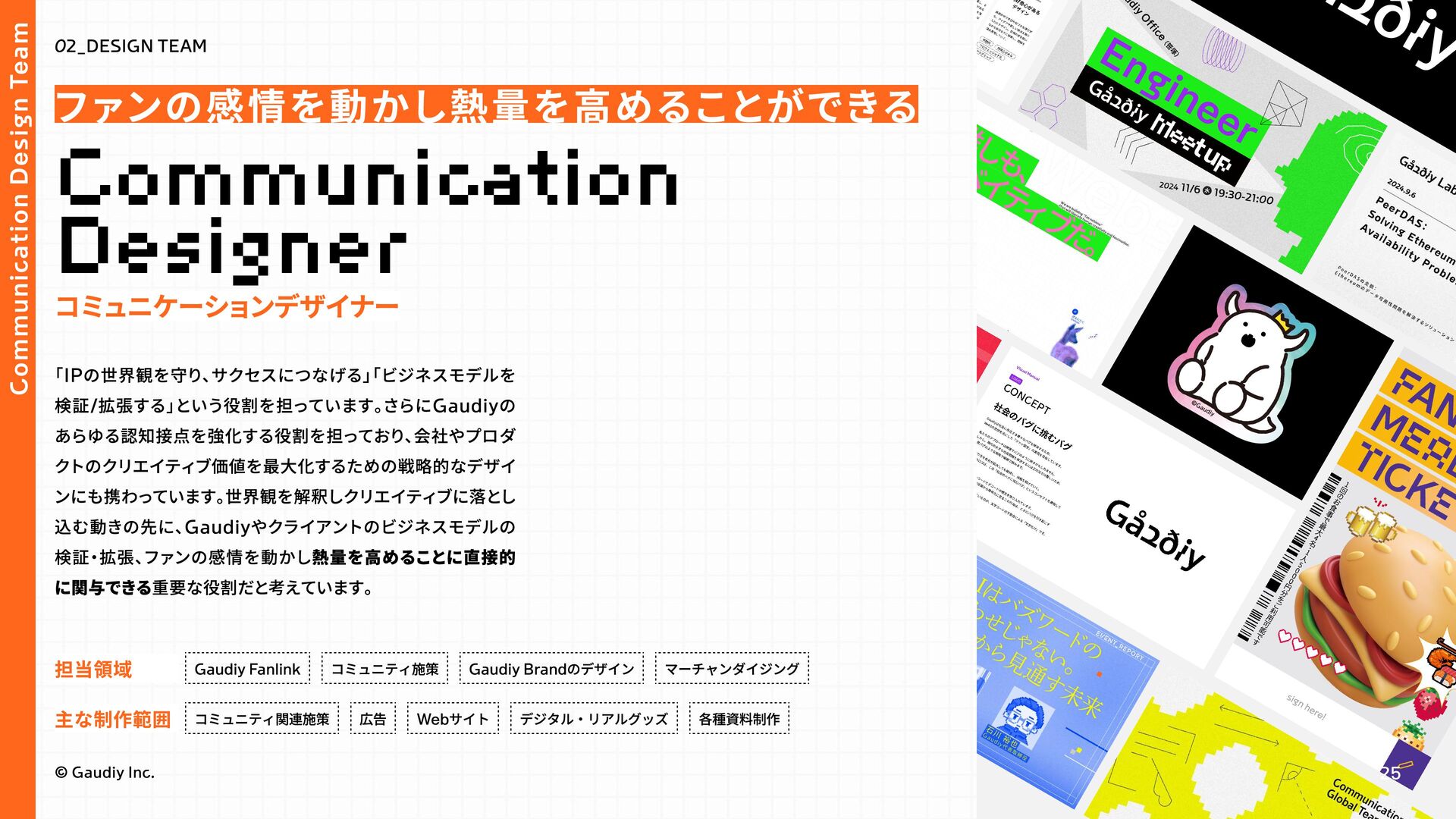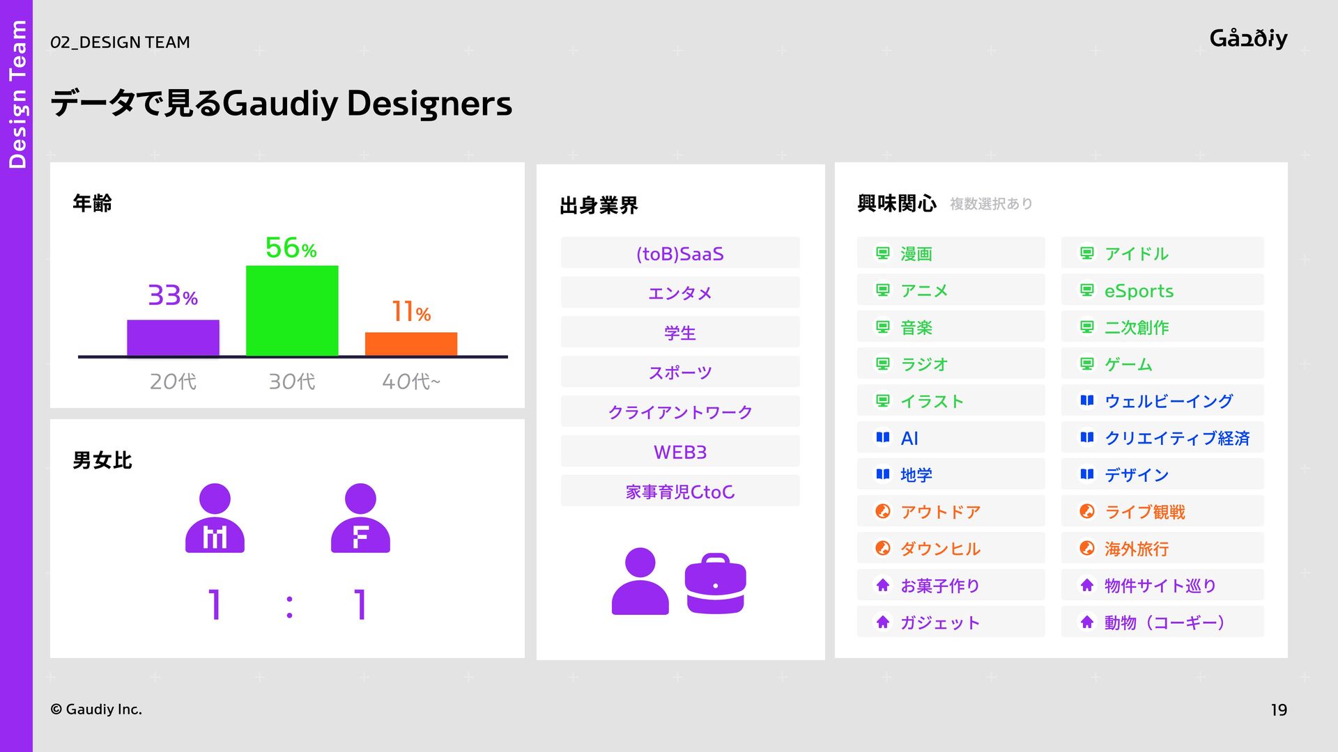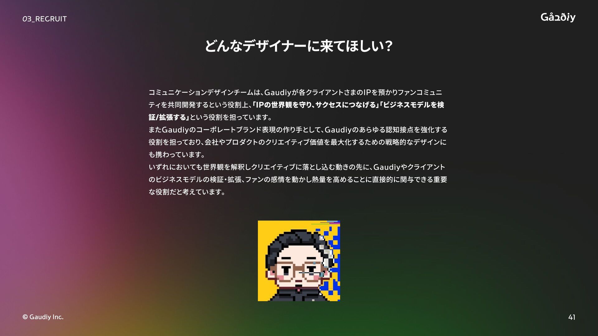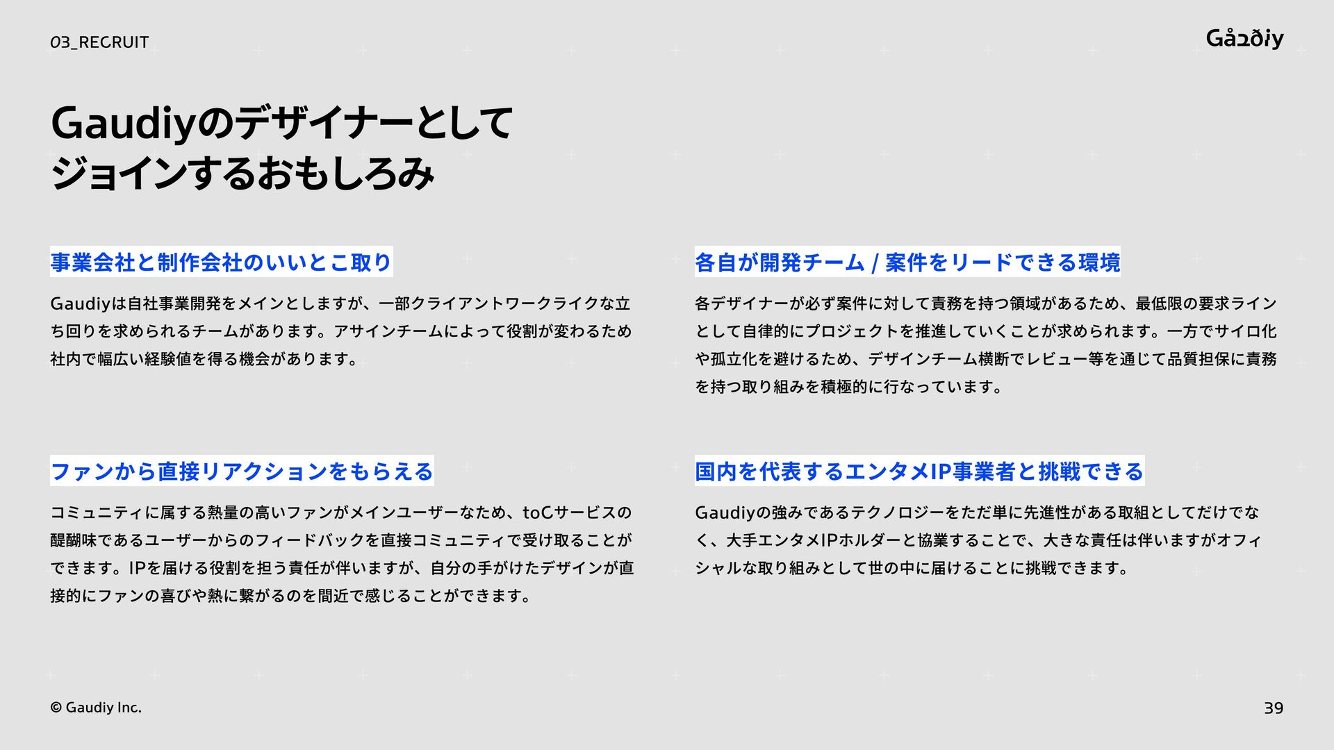 案件と並行して、 コミュニケーションデ ザインチーム横断でも情報共有やワークフロー整備を行い、 チーム内でのより良い制作環境づく りを行なっています。 施策 定例ミーティングや勉強会、デザインレビュー チームビルディング活動や文化づくり 社内ツールや発表会など 定例ミーティ ングや勉強会 スクラムイベント,All Hands,Monthly Doyaなどの 定例を実施し、各デザイナーの取り組んでいることを可 視化しています。 チームビルディ ング 必要な ワーク フローの 導入や ドキュ メントの 拡充に チーム メン バー 自ら取り組 み、チーム 全体のデザイン 品質の ボトム アップに努めています。 社内ツール Sla ckを 基本としな がら、 Not ionでの プロジェクト 管理、 制作にはFigmaとAdo be Creat ive Clo udの 両方を 使用 しています。 Figma Ado be Ill ust rato r Ado be Photosho p Chat GPT