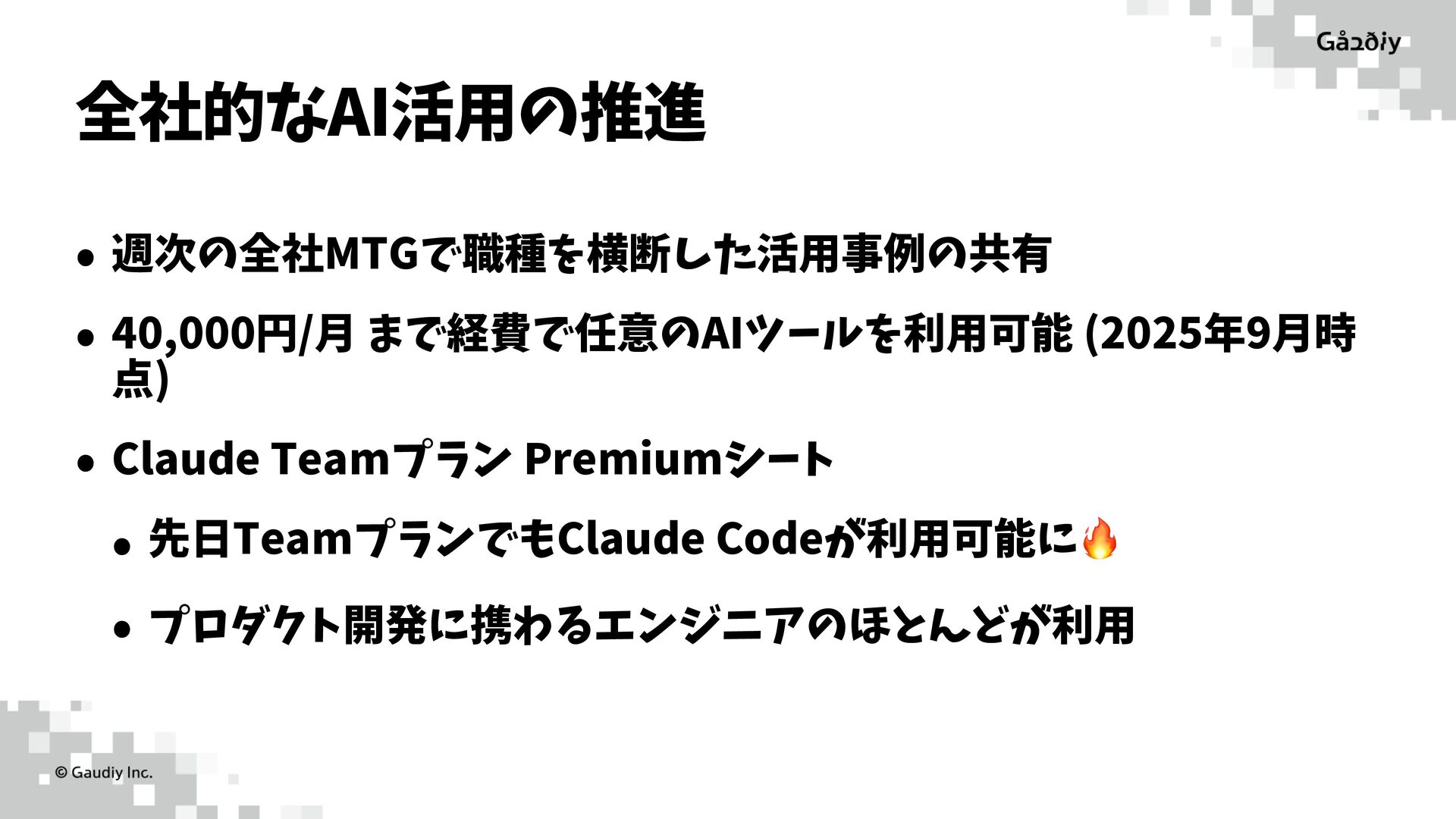 全社的なAI活用の推進 • 週次の全社MTGで職種を横断した活用事例の共有 • 40,000円/月 まで経費で任意のAIツールを利用可能 (2025年9月時 点) • Claude