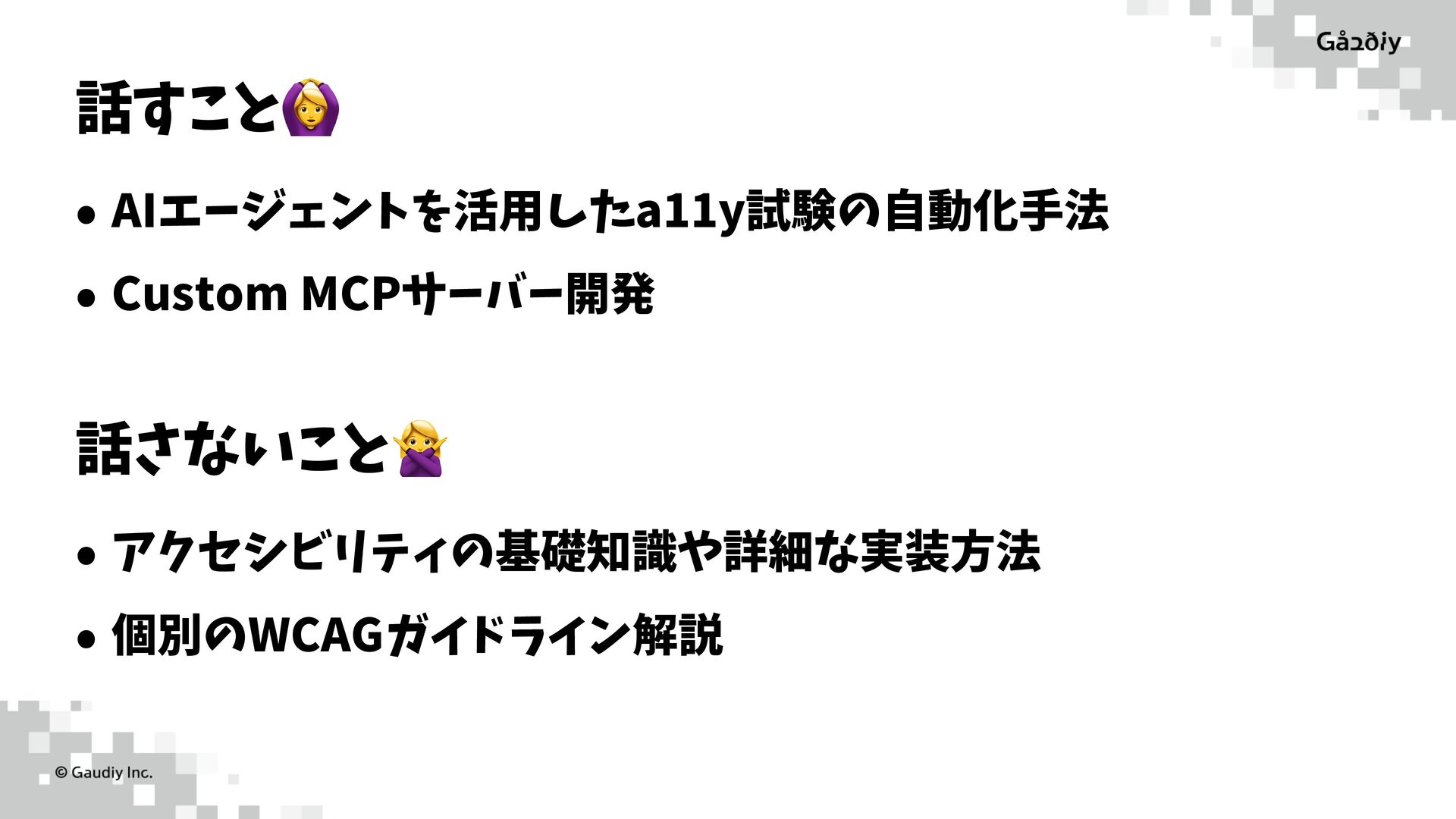 話すこと🙆 • AIエージェントを活用したa11y試験の自動化手法 • Custom MCPサーバー開発 話さないこと🙅 • アクセシビリティの基礎知識や詳細な実装方法 •