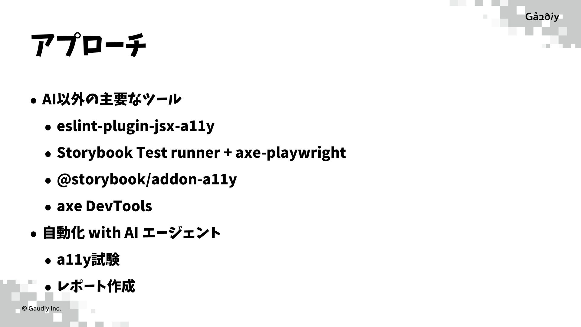 アプローチ • AI以外の主要なツール • eslint-plugin-jsx-a11y • Storybook Test runner +