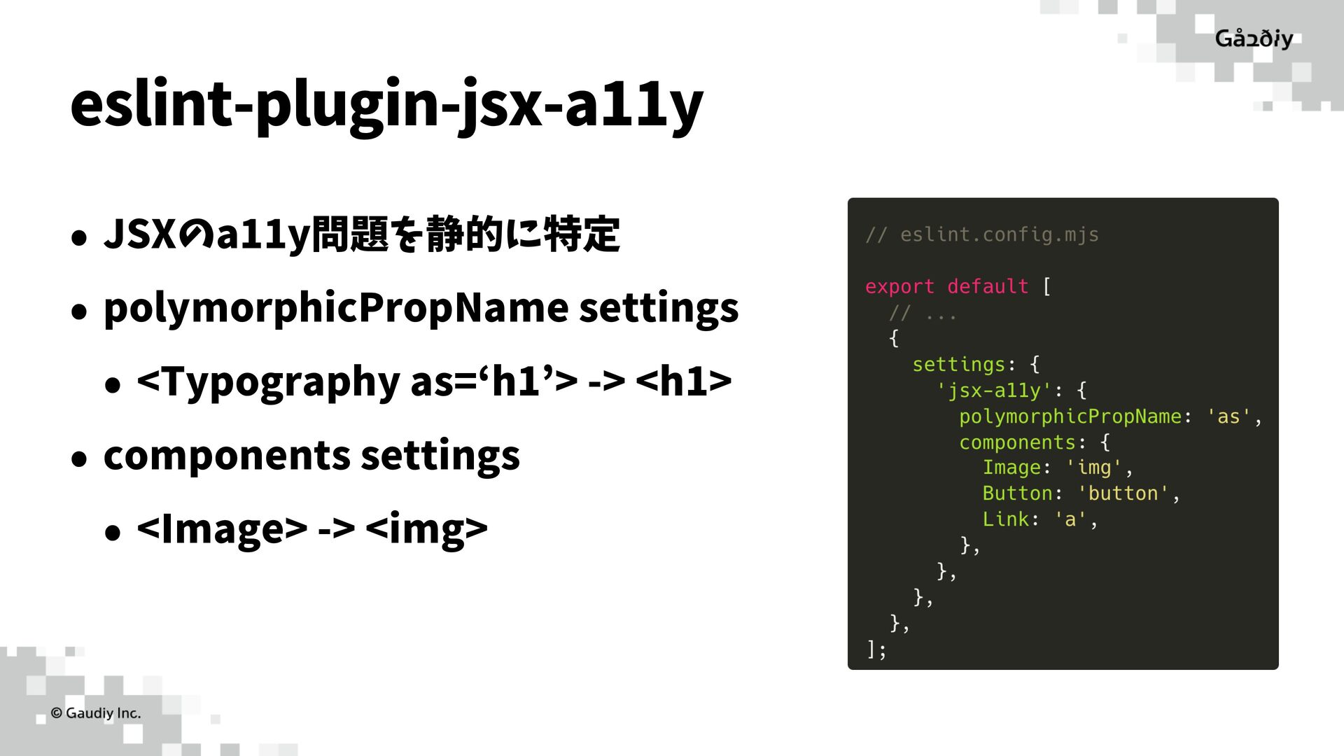 eslint-plugin-jsx-a11y • JSXのa11y問題を静的に特定 • polymorphicPropName settings • <Typography as=‘h1’> ->