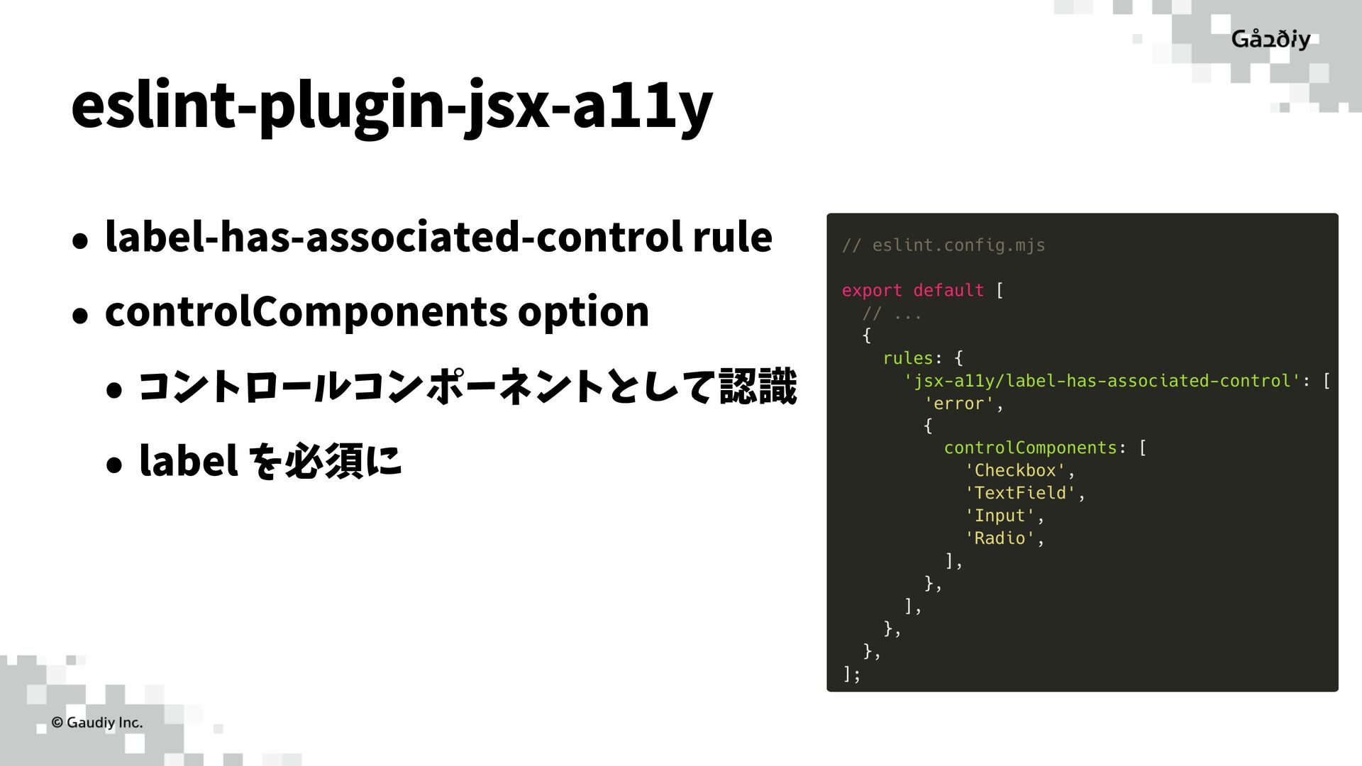 eslint-plugin-jsx-a11y • label-has-associated-control rule • controlComponents option • コントロールコンポーネントとして認識 •