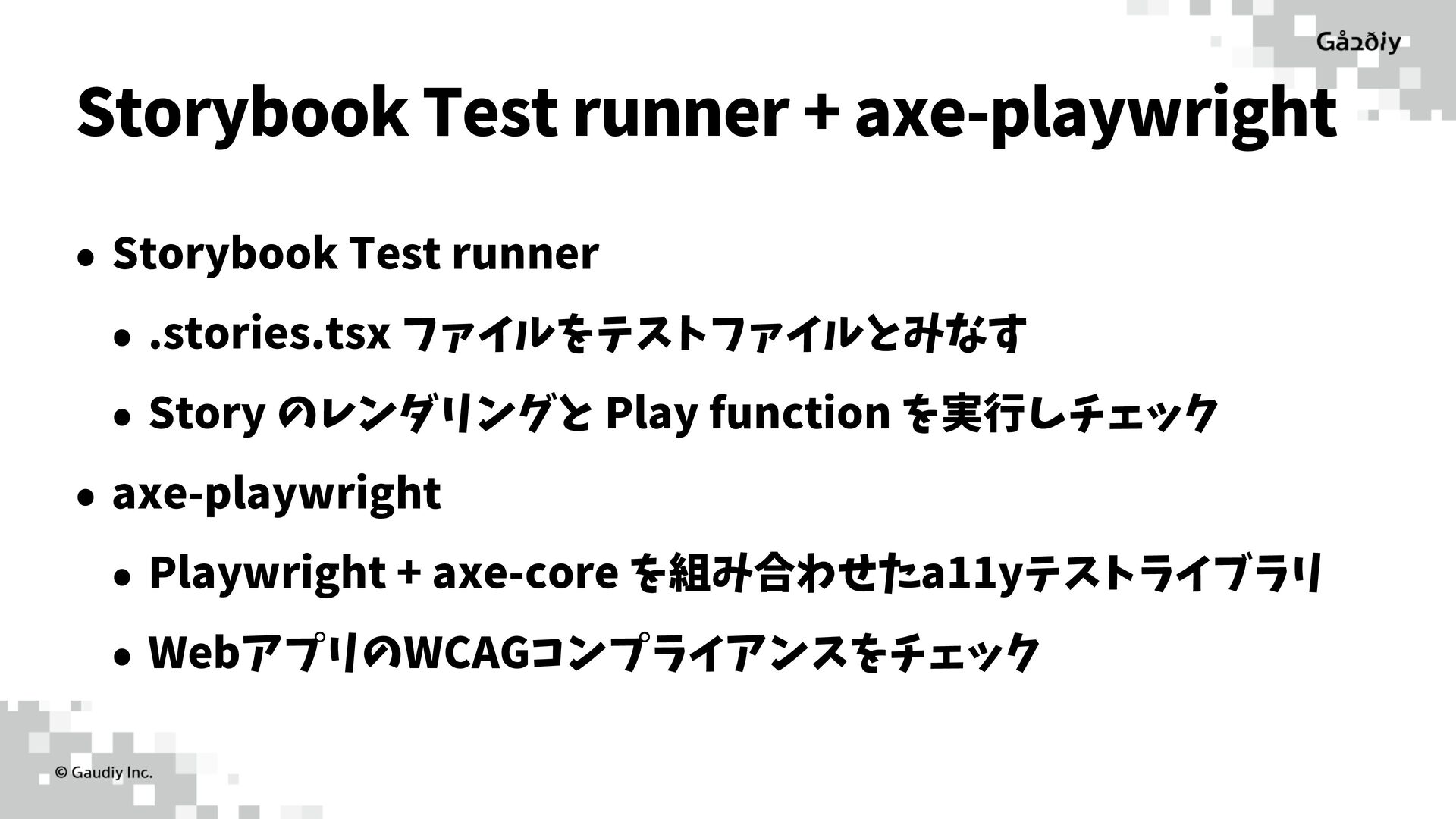 .stories.tsx ファイルをテストファイルとみなす • Story のレンダリングと Play function を実行しチェック • axe-playwright • Playwright + axe-core を組み合わせたa11yテストライブラリ • WebアプリのWCAGコンプライアンスをチェック