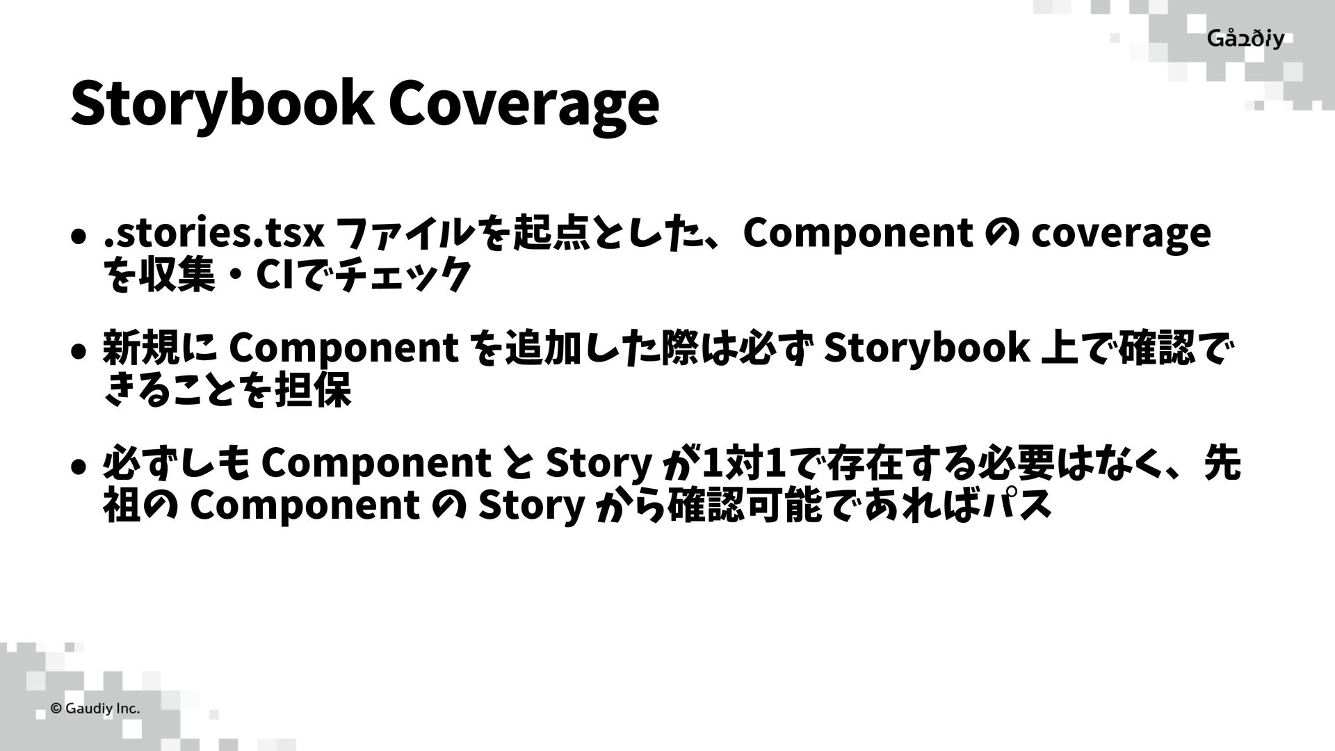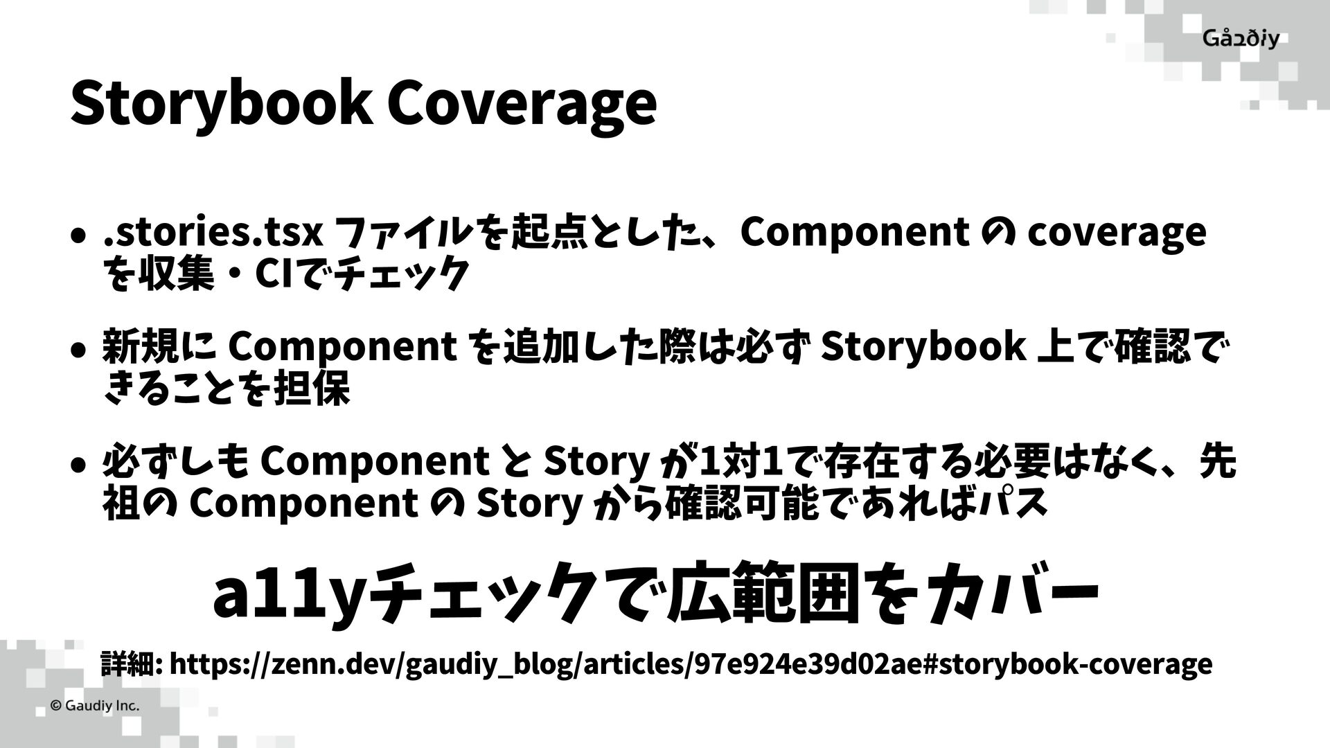 Component を追加した際は必ず Storybook 上で確認で きることを担保 • 必ずしも Component と Story が1対1で存在する必要はなく、先 祖の Component の Story から確認可能であればパス a11yチェックで広範囲をカバー 詳細: https://zenn.dev/gaudiy_blog/articles/97e924e39d02ae#storybook-coverage