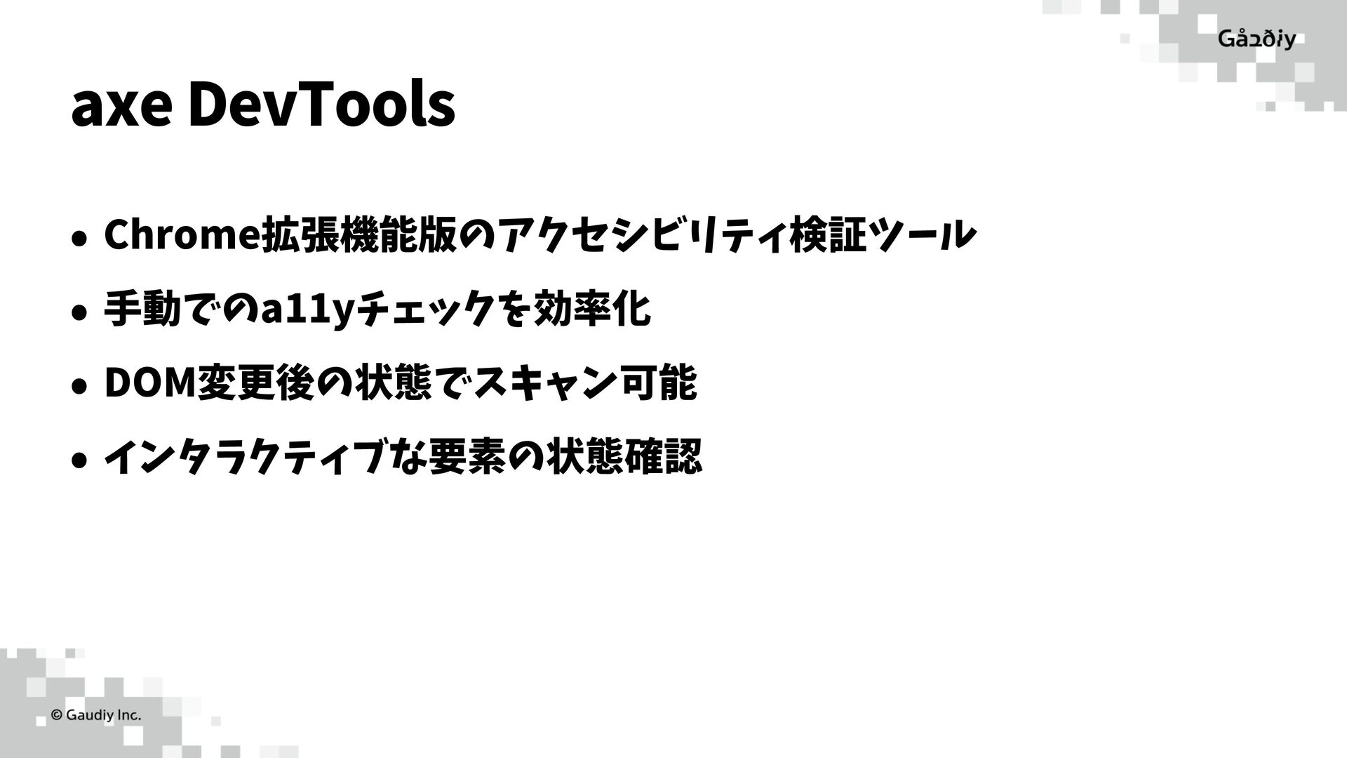 axe DevTools • Chrome拡張機能版のアクセシビリティ検証ツール • 手動でのa11yチェックを効率化 • DOM変更後の状態でスキャン可能 • インタラクティブな要素の状態確認