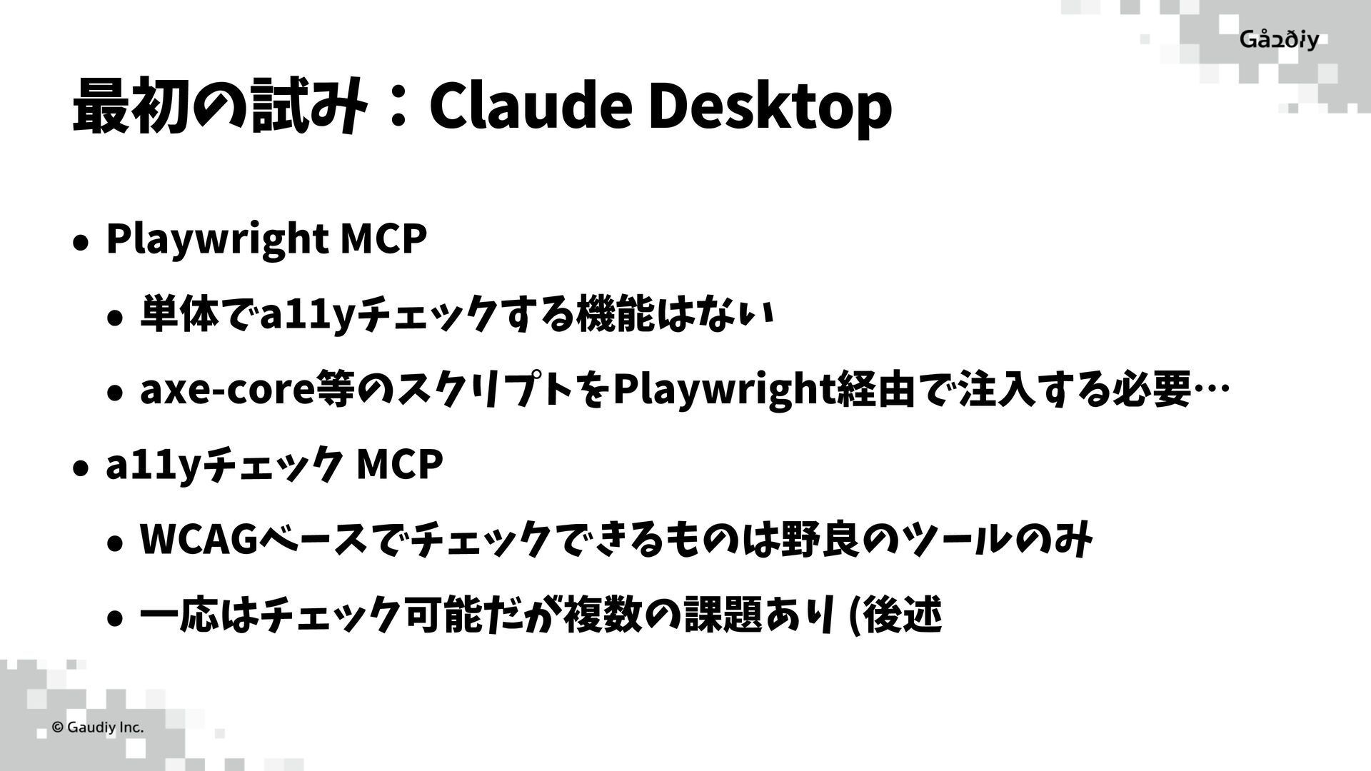 最初の試み:Claude Desktop • Playwright MCP • 単体でa11yチェックする機能はない • axe-core等のスクリプトをPlaywright経由で注入する必要… •
